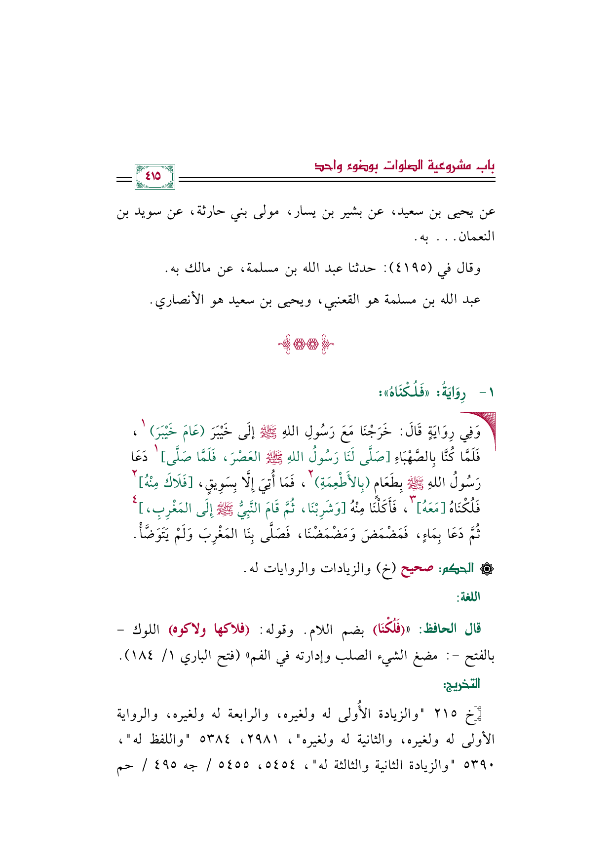 • وَفِي رِوَايَةٍ قَالَ: خَرَجْنَا مَعَ رَسُولِ اللهِ صلى الله عليه وسلم إلَى خَيْبَرَ (عَامَ خَيْبَرَ) ١، فَلَمَّا كُنَّا بِالصَّهْبَاءِ [صَلَّى لَنَا رَسُولُ اللهِ صلى الله عليه وسلم العَصْرَ، فَلَمَّا صَلَّى [١ دَعَا رَسُولُ اللهِ صلى الله عليه وسلم بِطَعَامٍ (بِالأَطْعِمَةِ) ٢، فَمَا أُتِيَ إِلَّا بِسَوِيقٍ، [فَلَاكَ مِنْهُ [٢ فَلُكْنَاهُ [مَعَهُ [٣، فَأَكَلْنَا مِنْهُ [وَشَرِبْنَا، ثُمَّ قَامَ النَّبِيُّ صلى الله عليه وسلم إِلَى المَغْرِبِ، [٤ ثُمَّ دَعَا بِمَاءٍ، فَمَضْمَضَ وَمَضْمَضْنَا، فَصَلَّى بِنَا المَغْرِبَ وَلَمْ يَتَوَضَّأْ.