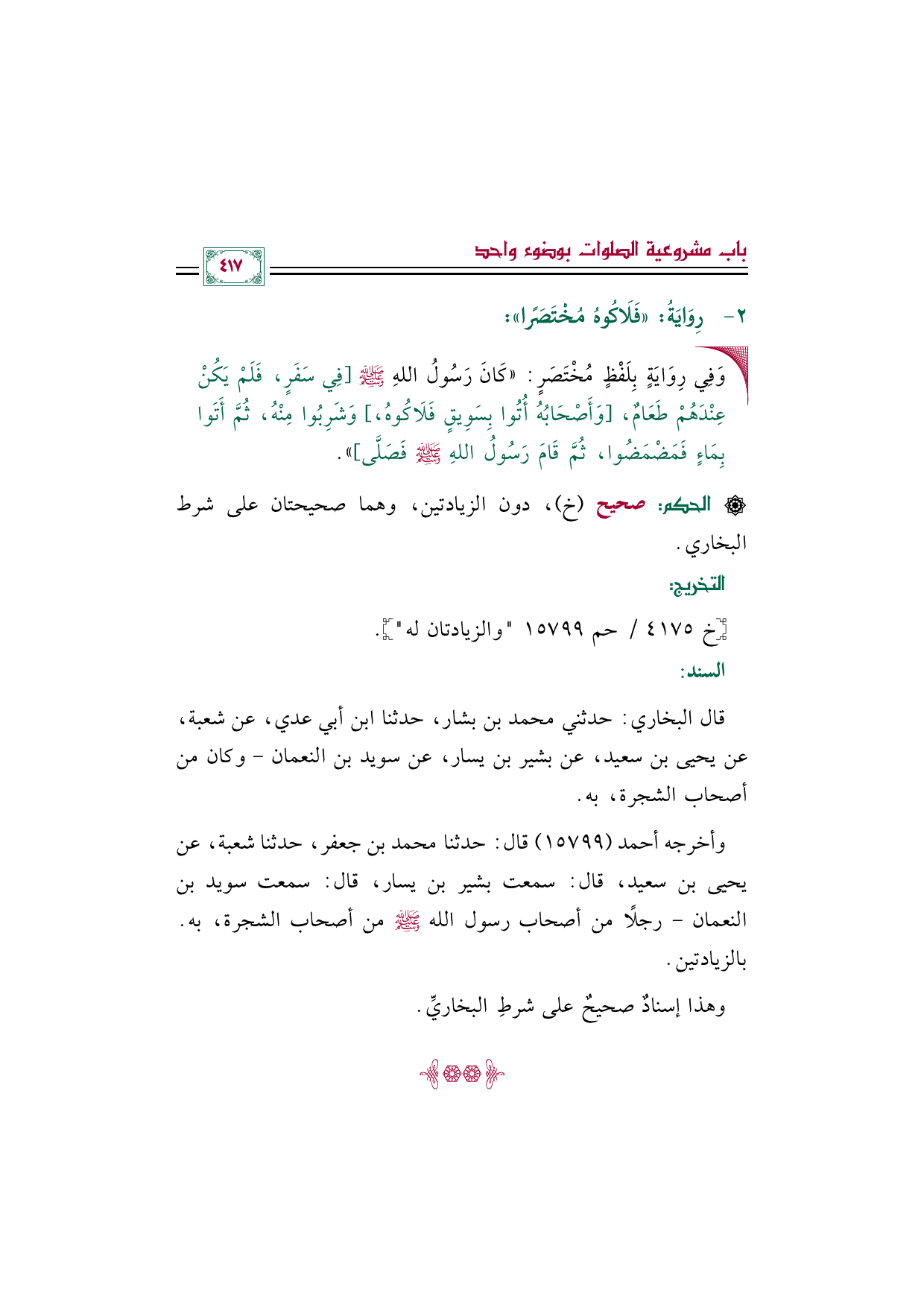 قال البخاري: حدثني محمد بن بشار، حدثنا ابن أبي عدي، عن شعبة، عن يحيى بن سعيد، عن بشير بن يسار، عن سويد بن النعمان- وكان من أصحاب الشجرة، به.