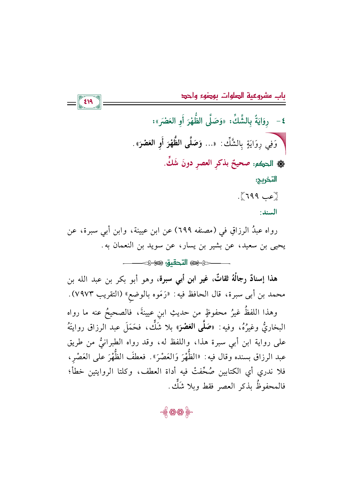 وهذا اللفظُ غيرُ محفوظٍ من حديثِ ابنِ عيينةَ، فالصحيحُ عنه ما رواه البخاريُّ وغيرُهُ، وفيه: «صَلَّى العَصْرَ» بلا شَكٍّ، فحَمَلَ عبد الرزاق روايتَهُ على رواية ابن أبي سبرة هذا، واللفظ له، وقد رواه الطبرانيُّ من طريق عبد الرزاق بسنده وقال فيه: «الظُّهْرَ وَالعَصْرَ». فعطفَ الظُّهْرَ على العَصْرِ، فلا ندري أي الكتابين صُحِّفتْ فيه أداة العطف، وكلتا الروايتين خطأ؛ فالمحفوظُ بذكر العصر فقط وبلا شَكٍّ.
