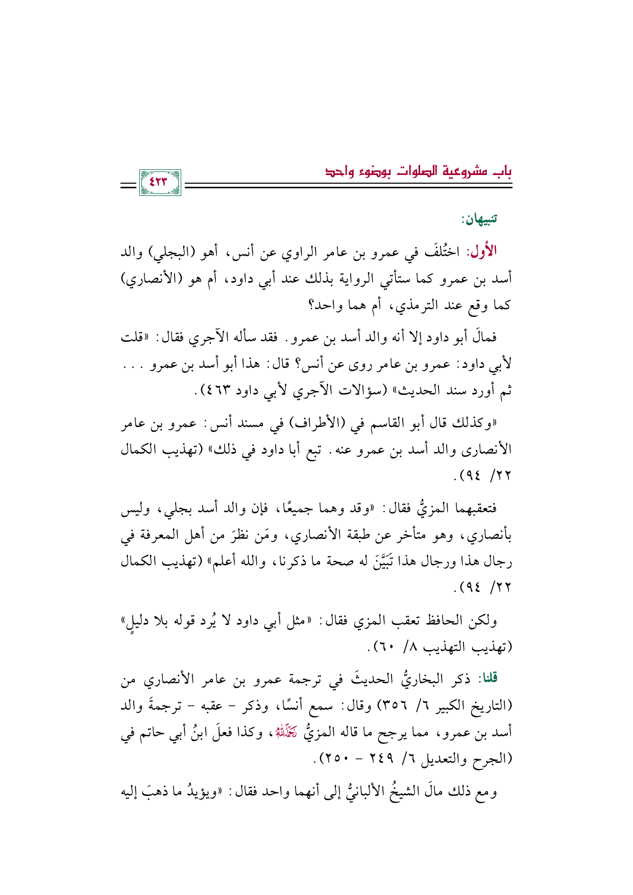 فمالَ أبو داود إلا أنه والد أسد بن عمرو. فقد سأله الآجري فقال: "قلت لأبي داود: عمرو بن عامر روى عن أنس؟ قال: هذا أبو أسد بن عمرو ... ثم أورد سند الحديث" (سؤالات الآجري لأبي داود ٤٦٣).