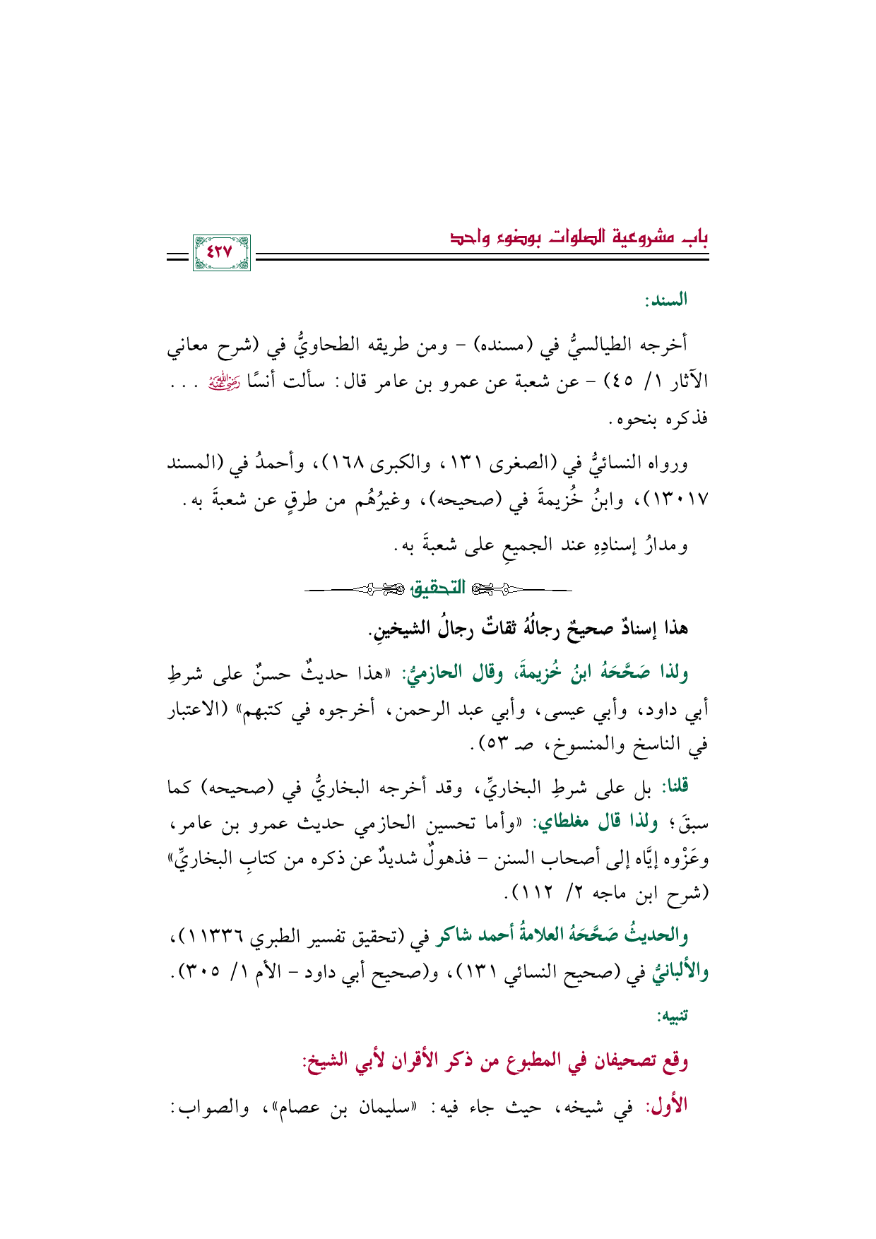 قلنا: بل على شرطِ البخاريِّ، وقد أخرجه البخاريُّ في (صحيحه) كما سبقَ؛ ولذا قال مغلطاي: "وأما تحسين الحازمي حديث عمرو بن عامر، وعَزْوه إيَّاه إلى أصحاب السنن- فذهولٌ شديدٌ عن ذكره من كتابِ البخاريِّ" (شرح ابن ماجه ٢/ ١١٢).