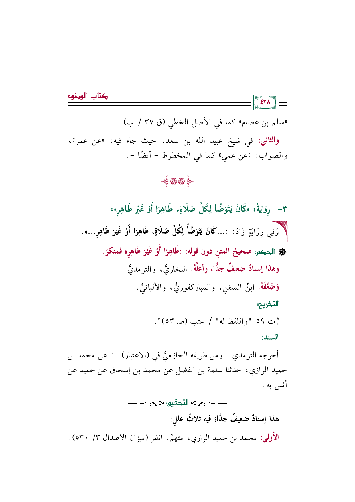 أخرجه الترمذي -ومن طريقه الحازميُّ في (الاعتبار) -: عن محمد بن حميد الرازي، حدثنا سلمة بن الفضل عن محمد بن إسحاق عن حميد عن أنس به.