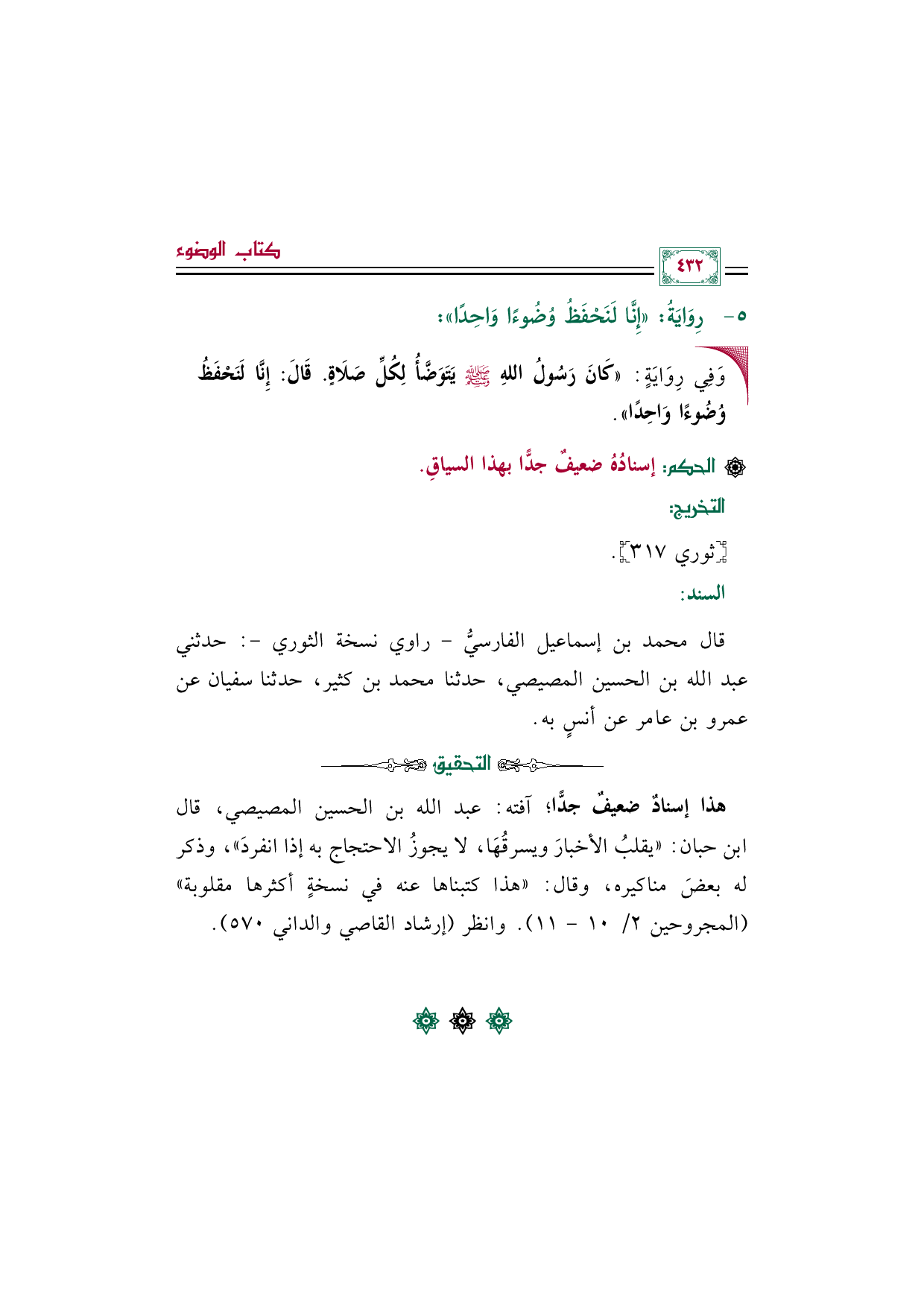 قال محمد بن إسماعيل الفارسيُّ -راوي نسخة الثوري-: حدثني عبد الله بن الحسين المصيصي، حدثنا محمد بن كثير، حدثنا سفيان عن عمرو بن عامر عن أنسٍ به.