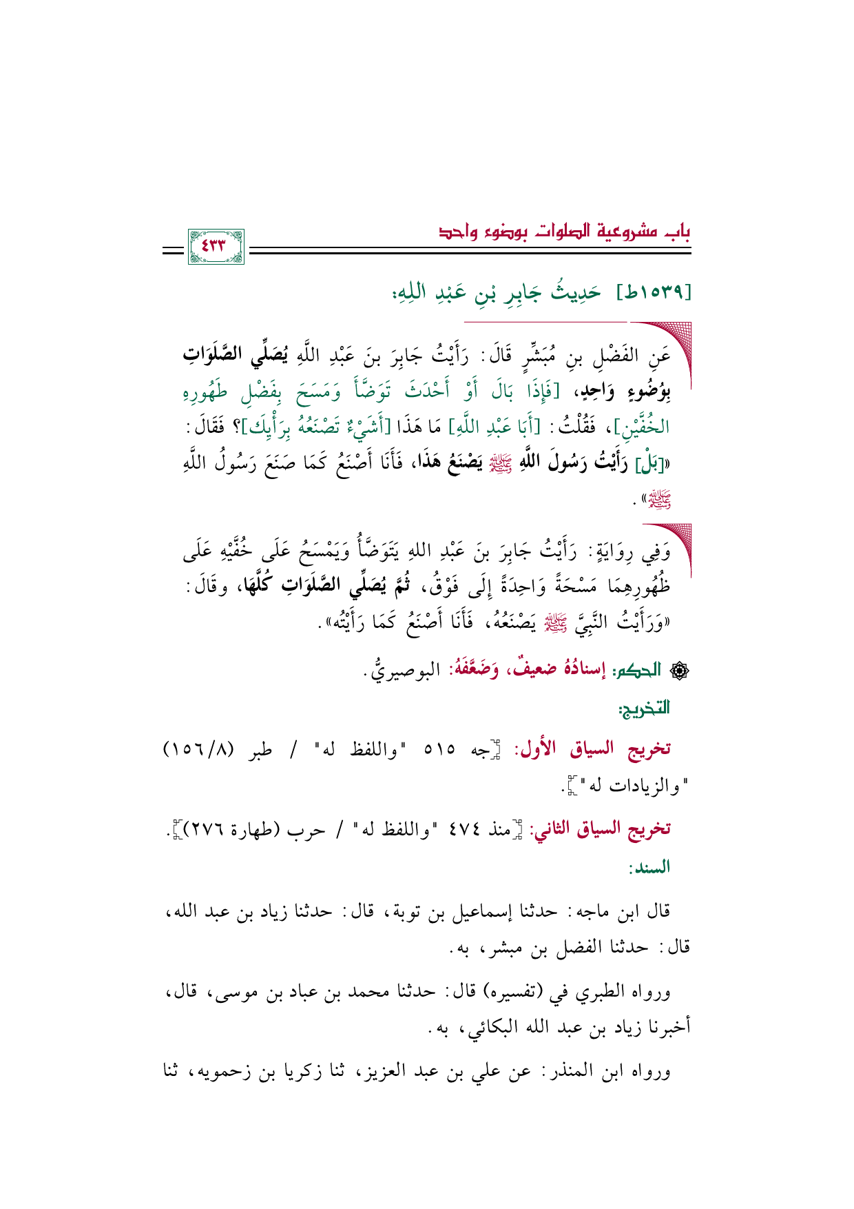 ◼ عَنِ الفَضْلِ بنِ مُبَشِّرٍ قَالَ: رَأَيْتُ جَابِرَ بنَ عَبْدِ اللَّهِ يُصَلِّي الصَّلَوَاتِ بِوُضُوءٍ وَاحِدٍ، [فَإِذَا بَالَ أَوْ أَحْدَثَ تَوَضَّأَ وَمَسَحَ بِفَضْلِ طَهُورِهِ الخُفَّيْنِ]، فَقُلْتُ: [أَبَا عَبْدِ اللَّهِ] مَا هَذَا [أَشَيْءٌ تَصْنَعُهُ بِرَأْيِكَ]؟ فَقَالَ: (([بَلْ] رَأَيْتُ رَسُولَ اللَّهِ صلى الله عليه وسلم يَصْنَعُ هَذَا، فَأَنَا أَصْنَعُ كَمَا صَنَعَ رَسُولُ اللَّهِ صلى الله عليه وسلم)).