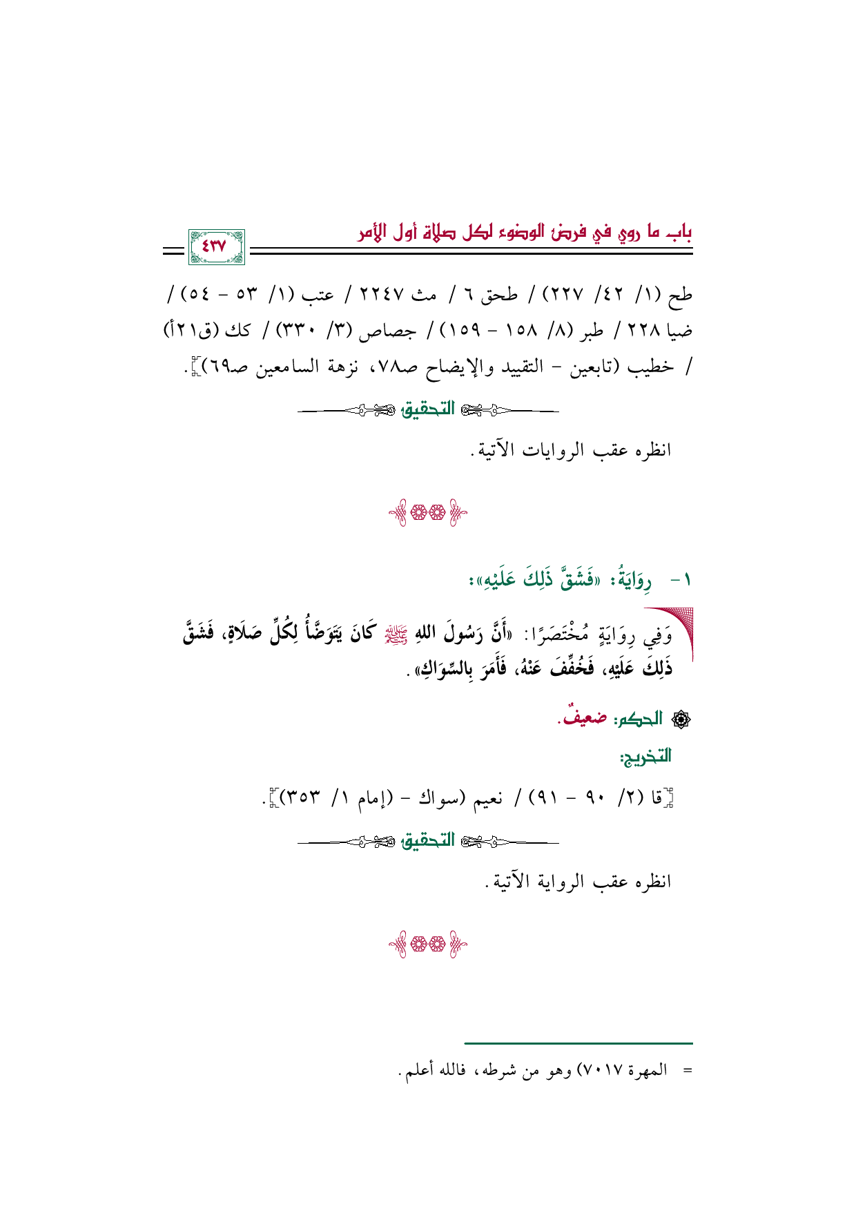 [التخريج]: [قا (٢/ ٩٠ - ٩١) / نعيم (سواك- (إمام ١/ ٣٥٣)].