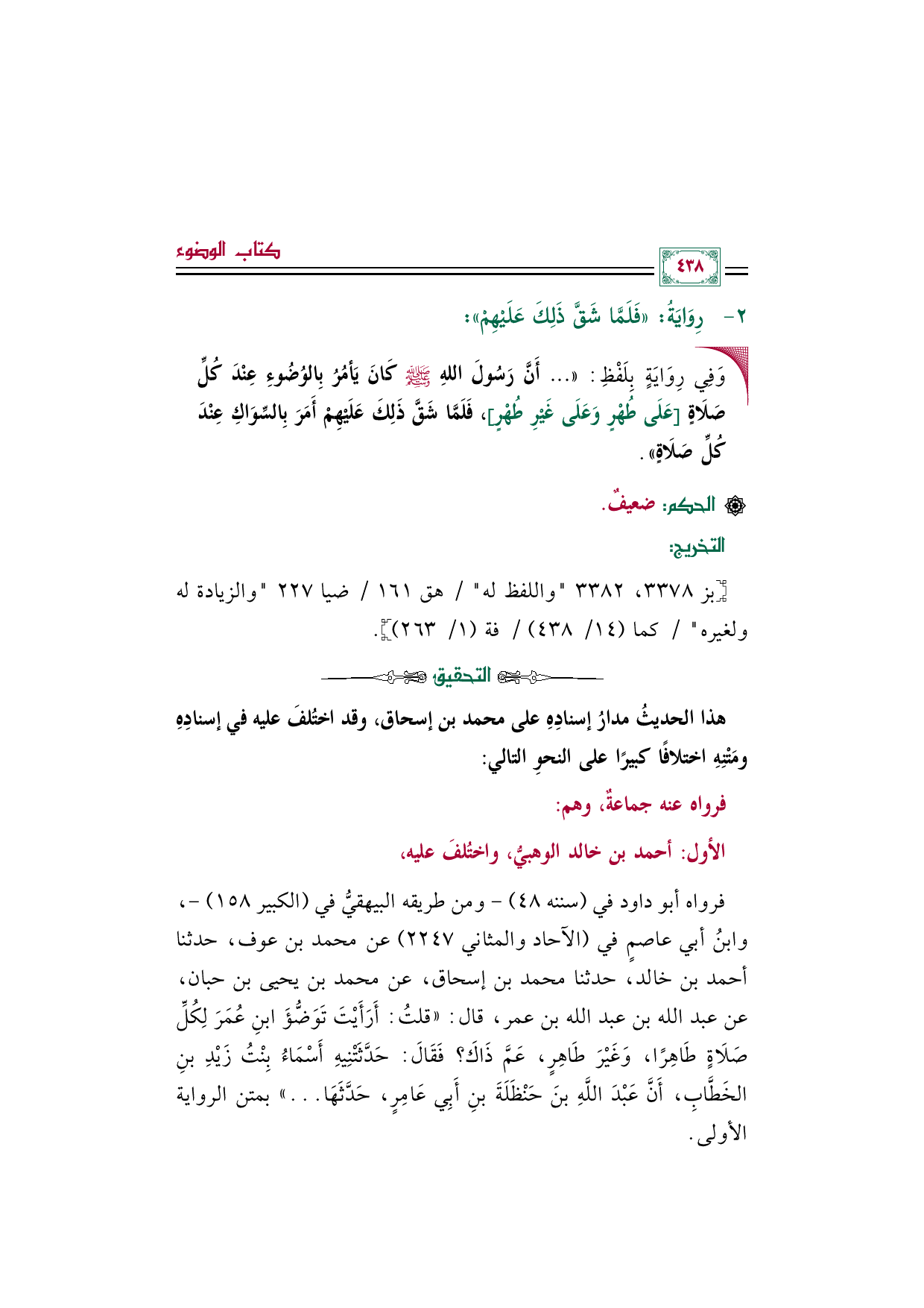 فرواه أبو داود في (سننه ٤٨) -ومن طريقه البيهقيُّ في (الكبير ١٥٨) -، وابنُ أبي عاصمٍ في (الآحاد والمثاني ٢٢٤٧) عن محمد بن عوف، حدثنا أحمد بن خالد، حدثنا محمد بن إسحاق، عن محمد بن يحيى بن حبان، عن عبد الله بن عبد الله بن عمر، قال: ((قلتُ: أَرَأَيْتَ تَوَضُّؤَ ابنِ عُمَرَ لِكُلِّ صَلَاةٍ طَاهِرًا، وَغَيْرَ طَاهِرٍ، عَمَّ ذَاكَ؟ فَقَالَ: حَدَّثَتْنِيهِ أَسْمَاءُ بِنْتُ زَيْدِ بنِ الخَطَّابِ، أَنَّ عَبْدَ اللَّهِ بنَ حَنْظَلَةَ بنِ أَبِي عَامِرٍ، حَدَّثَهَا ... )) بمتن الرواية الأولى.