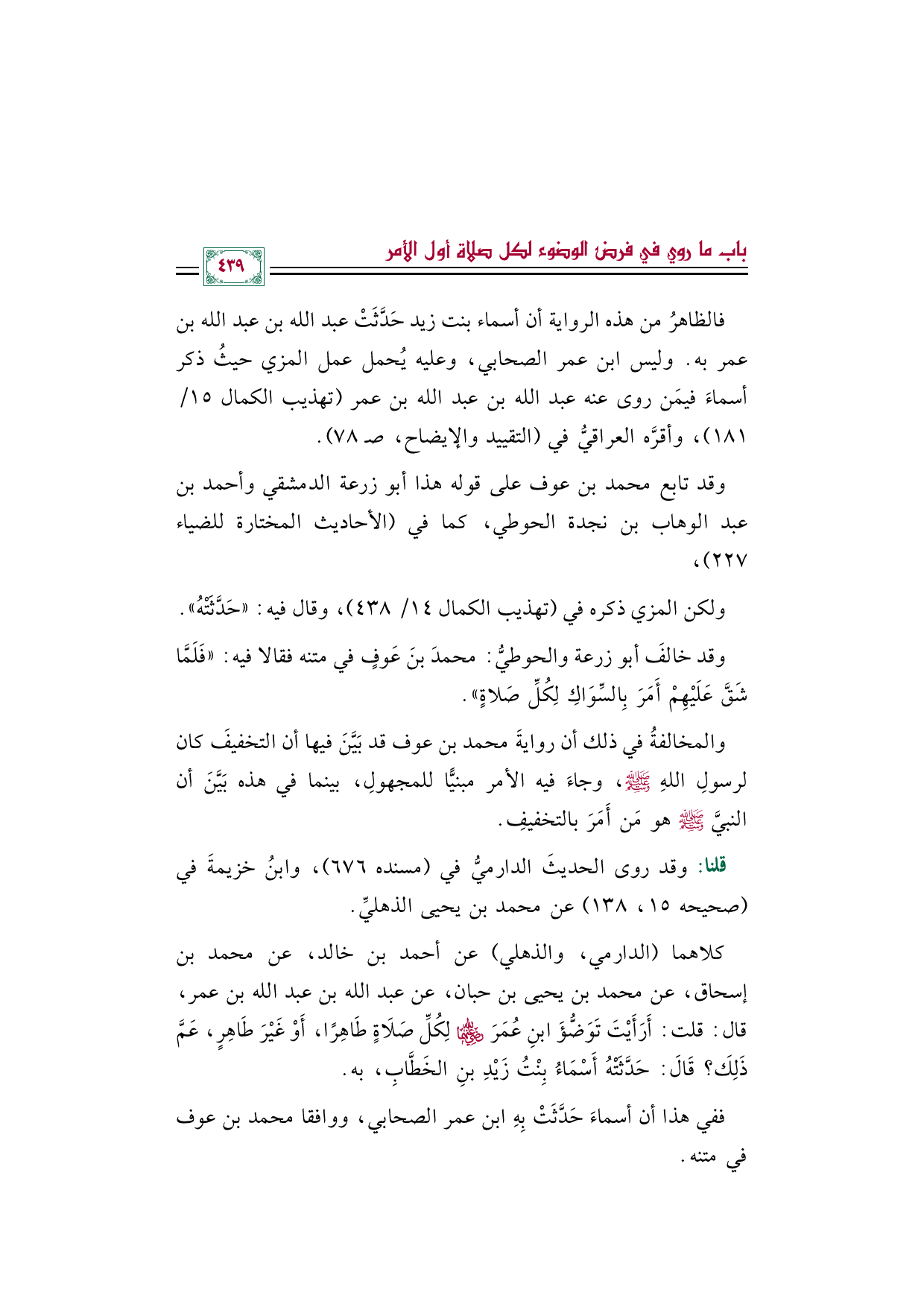 فالظاهرُ من هذه الرواية أن أسماء بنت زيد حَدَّثَتْ عبد الله بن عبد الله بن عمر به. وليس ابن عمر الصحابي، وعليه يُحمل عمل المزي حيثُ ذكر أسماءَ فيمَن روى عنه عبد الله بن عبد الله بن عمر (تهذيب الكمال ١٥/ ١٨١)، وأقرَّه العراقيُّ في (التقييد والإيضاح، صـ ٧٨).