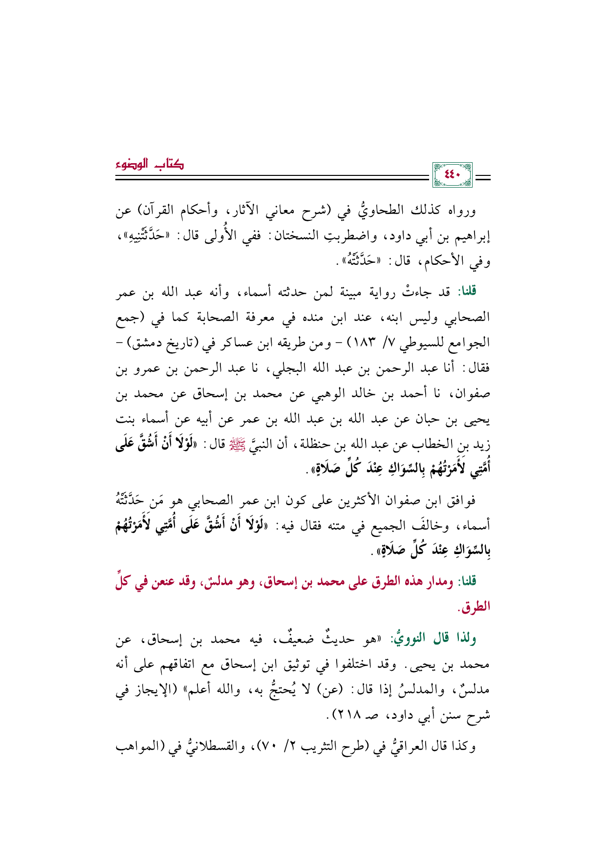 قلنا: قد جاءتْ رواية مبينة لمن حدثته أسماء، وأنه عبد الله بن عمر الصحابي وليس ابنه، عند ابن منده في معرفة الصحابة كما في (جمع الجوامع للسيوطي ٧/ ١٨٣) -ومن طريقه ابن عساكر في (تاريخ دمشق) - فقال: أنا عبد الرحمن بن عبد الله البجلي، نا عبد الرحمن بن عمرو بن صفوان، نا أحمد بن خالد الوهبي عن محمد بن إسحاق عن محمد بن يحيى بن حبان عن عبد الله بن عبد الله بن عمر عن أبيه عن أسماء بنت زيد بن الخطاب عن عبد الله بن حنظلة، أن النبيَّ صلى الله عليه وسلم قال: «لَوْلَا أَنْ أَشُقَّ عَلَى أُمَّتِي لَأَمَرْتُهُمْ بِالسِّوَاكِ عِنْدَ كُلِّ صَلَاةٍ».