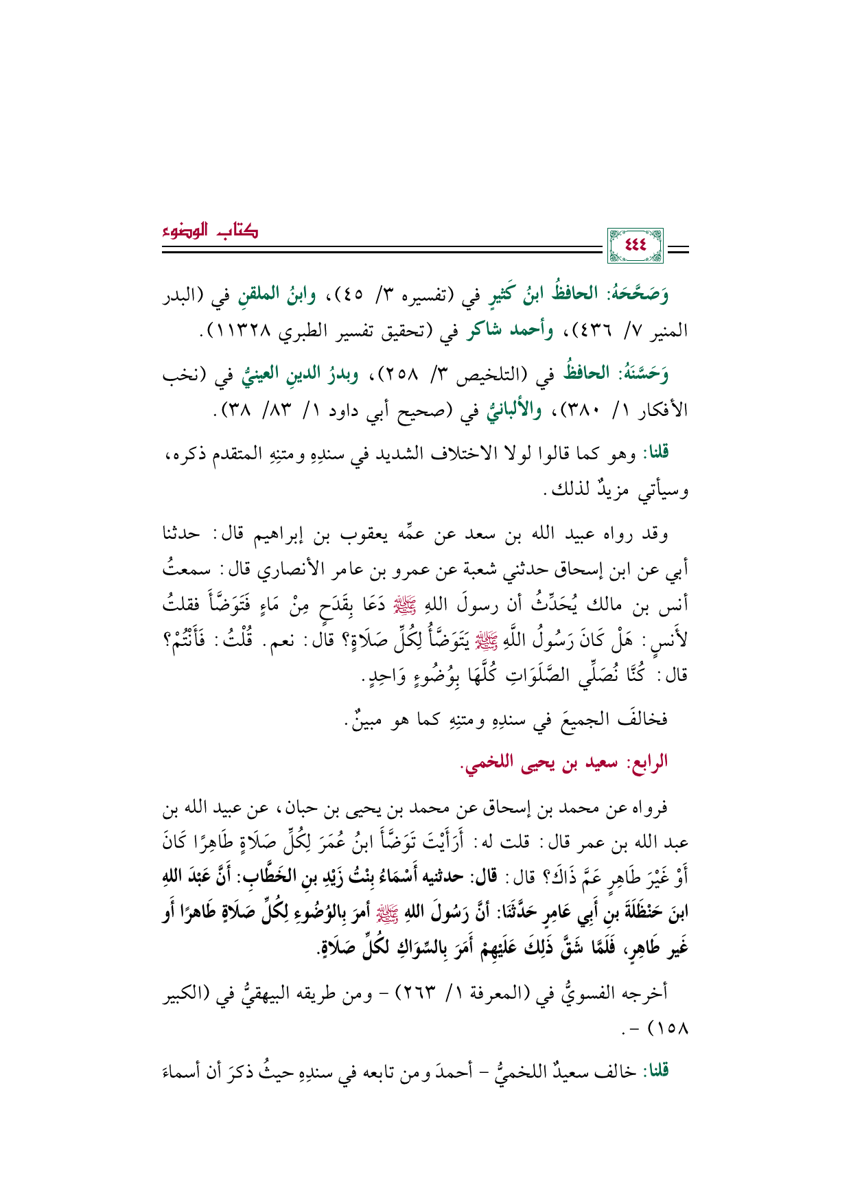 وقد رواه عبيد الله بن سعد عن عمِّه يعقوب بن إبراهيم قال: حدثنا أبي عن ابن إسحاق حدثني شعبة عن عمرو بن عامر الأنصاري قال: سمعتُ أنس بن مالك يُحَدِّثُ أن رسولَ اللهِ صلى الله عليه وسلم دَعَا بِقَدَحٍ مِنْ مَاءٍ فَتَوَضَّأَ فقلتُ لأَنسٍ: هَلْ كَانَ رَسُولُ اللَّهِ صلى الله عليه وسلم يَتَوَضَّأُ لِكُلِّ صَلَاةٍ؟ قال: نعم. قُلْتُ: فَأَنْتُمْ؟ قال: كُنَّا نُصَلِّي الصَّلَوَاتِ كُلَّهَا بِوُضُوءٍ وَاحِدٍ.