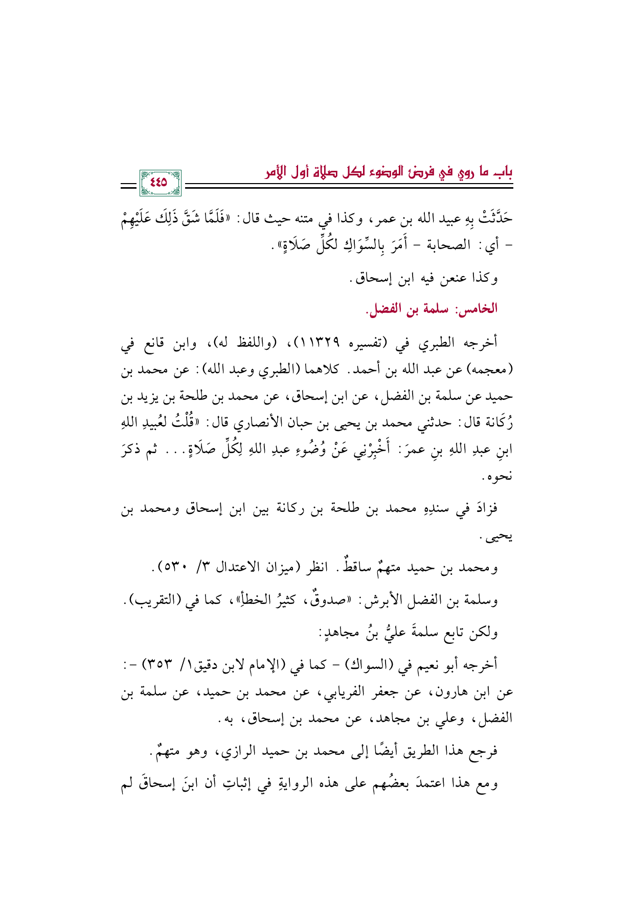 أخرجه الطبري في (تفسيره ١١٣٢٩)، (واللفظ له)، وابن قانع في (معجمه) عن عبد الله بن أحمد. كلاهما (الطبري وعبد الله): عن محمد بن حميد عن سلمة بن الفضل، عن ابن إسحاق، عن محمد بن طلحة بن يزيد بن رُكَانة قال: حدثني محمد بن يحيى بن حبان الأنصاري قال: ((قُلْتُ لعُبيدِ اللهِ بنِ عبدِ اللهِ بنِ عمرَ: أَخْبِرْنِي عَنْ وُضُوءِ عبدِ اللهِ لِكُلِّ صَلَاةٍ ... ثم ذكرَ نحوه.