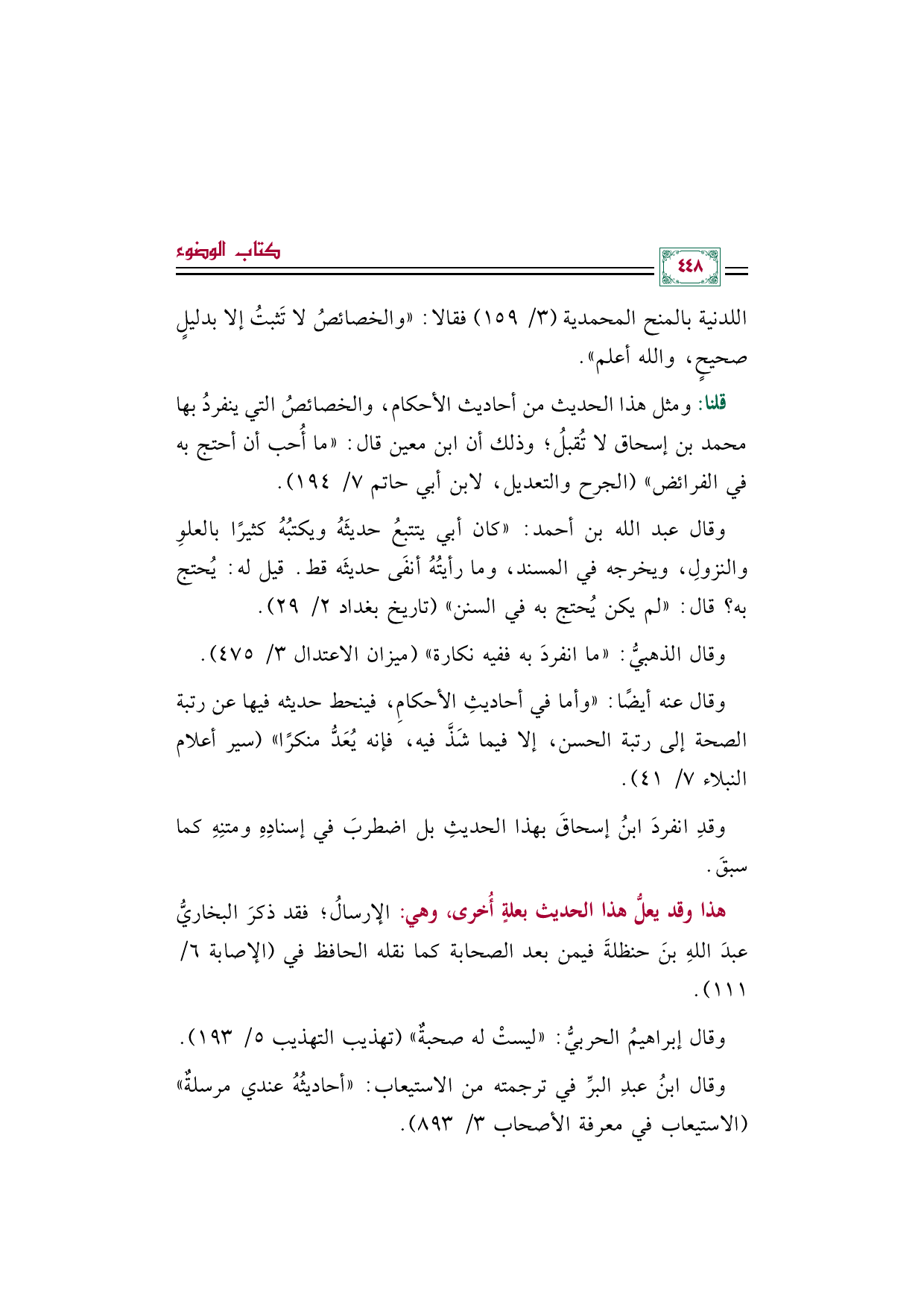 قلنا: ومثل هذا الحديث من أحاديث الأحكام، والخصائصُ التي ينفردُ بها محمد بن إسحاق لا تُقبلُ؛ وذلك أن ابن معين قال: "ما أُحب أن أحتج به في الفرائض" (الجرح والتعديل، لابن أبي حاتم ٧/ ١٩٤).