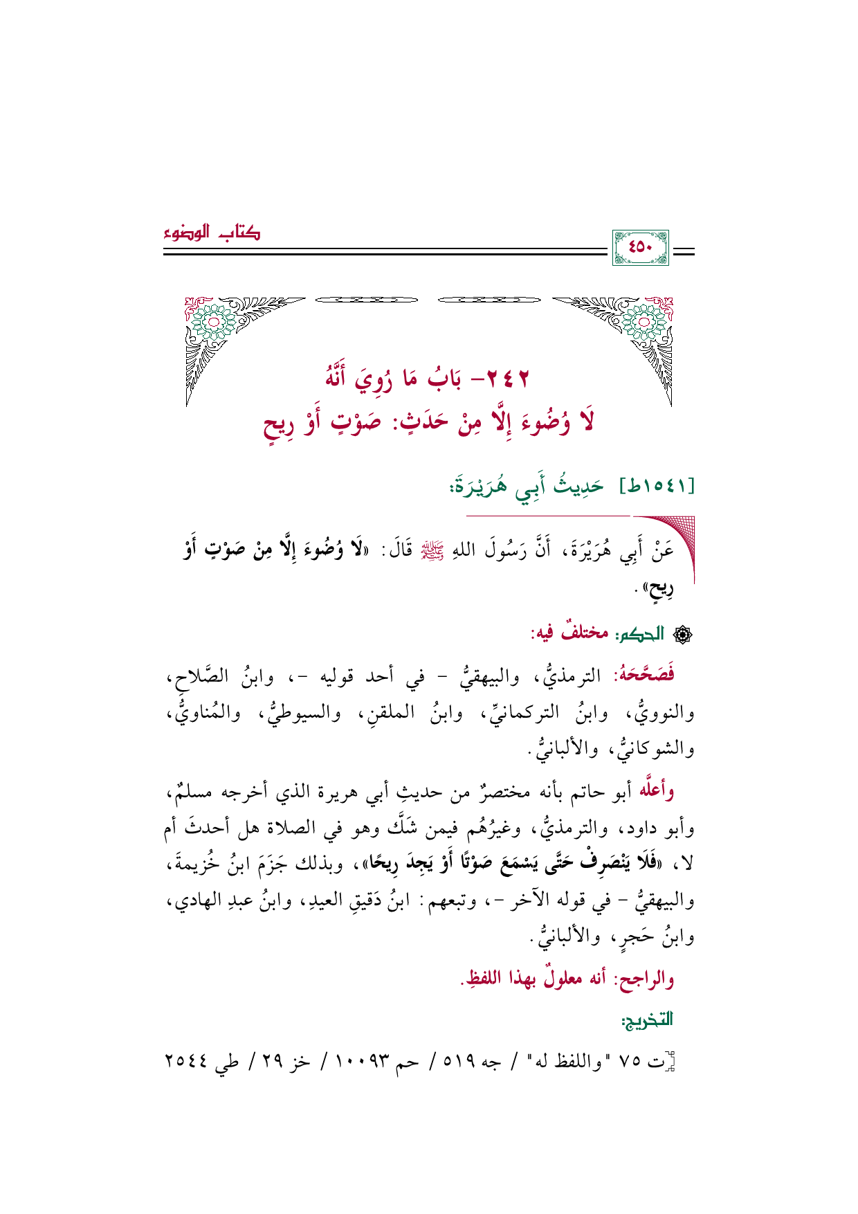 ٢٤٢ - بَابُ مَا رُوِيَ أَنَّهُ لَا وُضُوءَ إِلَّا مِنْ حَدَثٍ: صَوْتٍ أَوْ رِيحٍ