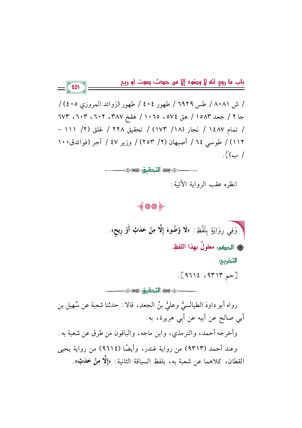 • وَفِي رِوَايَةٍ بِلَفْظِ: «لَا وُضُوءَ إِلَّا مِنْ حَدَثٍ أَوْ رِيحٍ».
