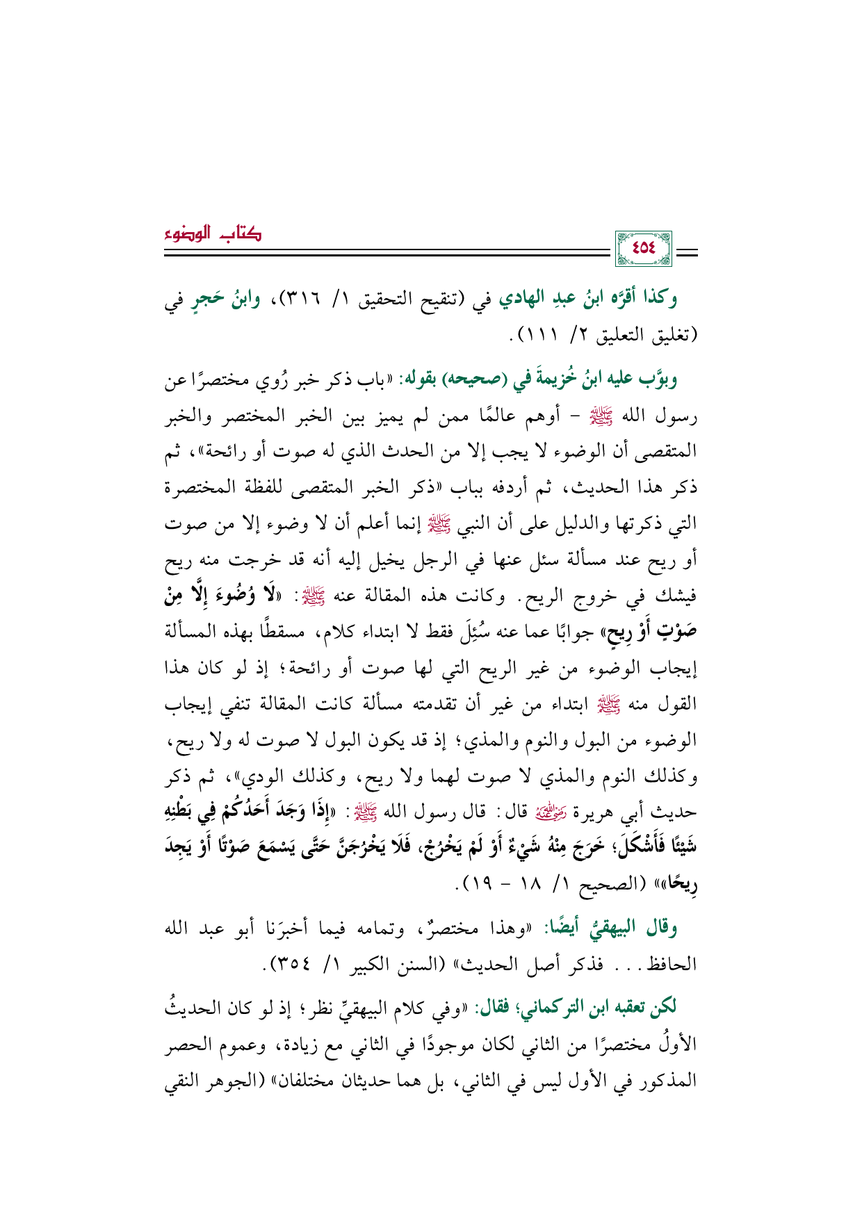 وبوَّب عليه ابنُ خُزيمةَ في (صحيحه) بقوله: "باب ذكر خبر رُوي مختصرًا عن رسول الله صلى الله عليه وسلم- أوهم عالمًا ممن لم يميز بين الخبر المختصر والخبر المتقصى أن الوضوء لا يجب إلا من الحدث الذي له صوت أو رائحة"، ثم ذكر هذا الحديث، ثم أردفه بباب "ذكر الخبر المتقصى للفظة المختصرة التي ذكرتها والدليل على أن النبي صلى الله عليه وسلم إنما أعلم أن لا وضوء إلا من صوت أو ريح عند مسألة سئل عنها في الرجل يخيل إليه أنه قد خرجت منه ريح فيشك في خروج الريح. وكانت هذه المقالة عنه صلى الله عليه وسلم: «لَا وُضُوءَ إِلَّا مِنْ صَوْتٍ أَوْ رِيحٍ» جوابًا عما عنه سُئِلَ فقط لا ابتداء كلام، مسقطًا بهذه المسألة إيجاب الوضوء من غير الريح التي لها صوت أو رائحة؛ إذ لو كان هذا القول منه صلى الله عليه وسلم ابتداء من غير أن تقدمته مسألة كانت المقالة تنفي إيجاب الوضوء من البول والنوم والمذي؛ إذ قد يكون البول لا صوت له ولا ريح، وكذلك النوم والمذي لا صوت لهما ولا ريح، وكذلك الودي"، ثم ذكر حديث أبي هريرة رضي الله عنه قال: قال رسول الله صلى الله عليه وسلم: «إِذَا وَجَدَ أَحَدُكُمْ فِي بَطْنِهِ شَيْئًا فَأَشْكَلَ؛ خَرَجَ مِنْهُ شَيْءٌ أَوْ لَمْ يَخْرُجْ، فَلَا يَخْرُجَنَّ حَتَّى يَسْمَعَ صَوْتًا أَوْ يَجِدَ رِيحًا» " (الصحيح ١/ ١٨ - ١٩).