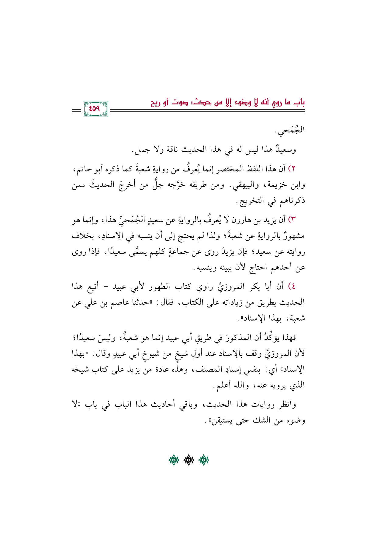 ٣) أن يزيد بن هارون لا يُعرفُ بالروايةِ عن سعيدٍ الجُمَحيِّ هذا، وإنما هو مشهورٌ بالروايةِ عن شعبةَ؛ ولذا لم يحتج إلى أن ينسبه في الإسنادِ، بخلاف روايته عن سعيد؛ فإن يزيدَ روى عن جماعةٍ كلهم يسمَّى سعيدًا، فإذا روى عن أحدهم احتاج لأن يبينه وينسبه.