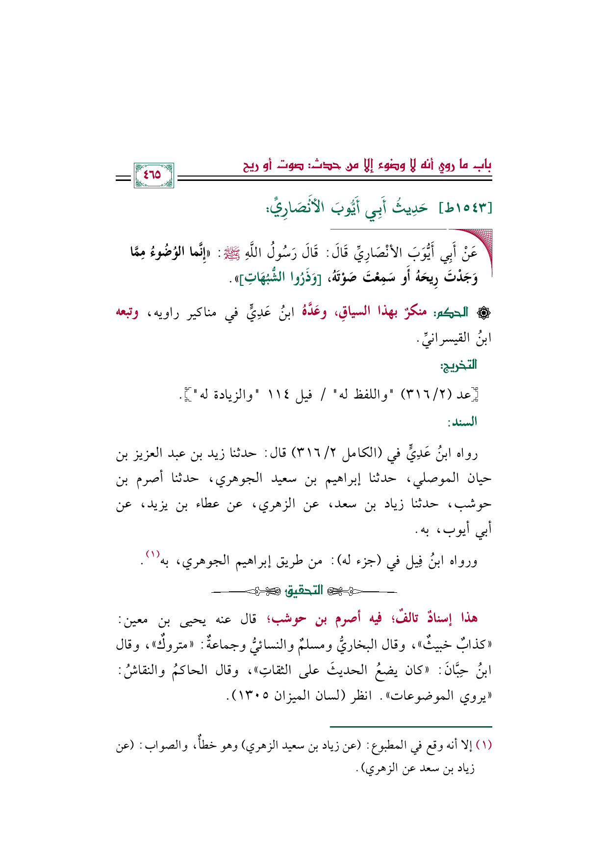 رواه ابنُ عَدِيٍّ في (الكامل ٢/ ٣١٦) قال: حدثنا زيد بن عبد العزيز بن حيان الموصلي، حدثنا إبراهيم بن سعيد الجوهري، حدثنا أصرم بن حوشب، حدثنا زياد بن سعد، عن الزهري، عن عطاء بن يزيد، عن أبي أيوب، به.