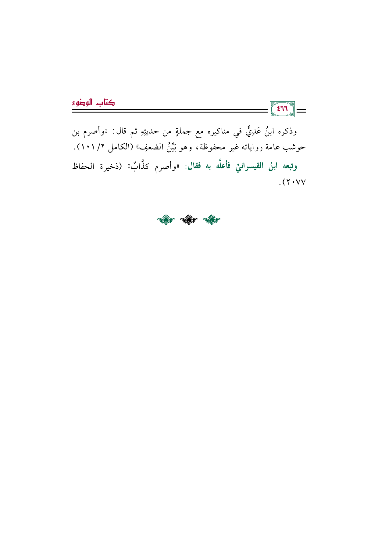 وذكره ابنُ عَدِيٍّ في مناكيره مع جملةٍ من حديثِهِ ثم قال: "وأصرم بن حوشب عامة رواياته غير محفوظة، وهو بَيِّنُ الضعفِ" (الكامل ٢/ ١٠١).