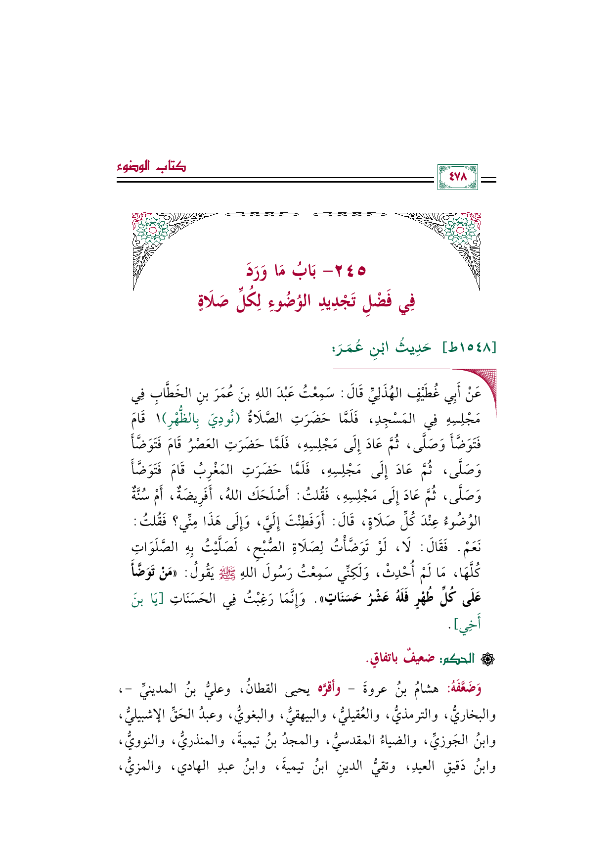 ◼ عَنْ أَبِي غُطَيْفٍ الهُذَلِيِّ قَالَ: سَمِعْتُ عَبْدَ اللهِ بنَ عُمَرَ بنِ الخَطَّابِ فِي مَجْلِسِهِ فِي المَسْجِدِ، فَلَمَّا حَضَرَتِ الصَّلَاةُ (نُودِيَ بِالظُّهْرِ) ١ قَامَ فَتَوَضَّأَ وَصَلَّى، ثُمَّ عَادَ إِلَى مَجْلِسِهِ، فَلَمَّا حَضَرَتِ العَصْرُ قَامَ فَتَوَضَّأَ وَصَلَّى، ثُمَّ عَادَ إِلَى مَجْلِسِهِ، فَلَمَّا حَضَرَتِ المَغْرِبُ قَامَ فَتَوَضَّأَ وَصَلَّى، ثُمَّ عَادَ إِلَى مَجْلِسِهِ، فَقُلتُ: أَصْلَحَكَ اللهُ، أَفَرِيضَةٌ، أَمْ سُنَّةٌ الوُضُوءُ عِنْدَ كُلِّ صَلَاةٍ، قَالَ: أَوَفَطِنْتَ إِلَيَّ، وَإِلَى هَذَا مِنِّي؟ فَقُلتُ: نَعَمْ. فَقَالَ: لَا، لَوْ تَوَضَّأْتُ لِصَلَاةِ الصُّبْحِ، لَصَلَّيْتُ بِهِ الصَّلَوَاتِ كُلَّهَا، مَا لَمْ أُحْدِثْ، وَلَكِنِّي سَمِعْتُ رَسُولَ اللهِ صلى الله عليه وسلم يَقُولُ: «مَنْ تَوَضَّأَ عَلَى كُلِّ طُهْرٍ فَلَهُ عَشْرُ حَسَنَاتٍ». وَإِنَّمَا رَغِبْتُ فِي الحَسَنَاتِ [يَا بنَ أَخِي].