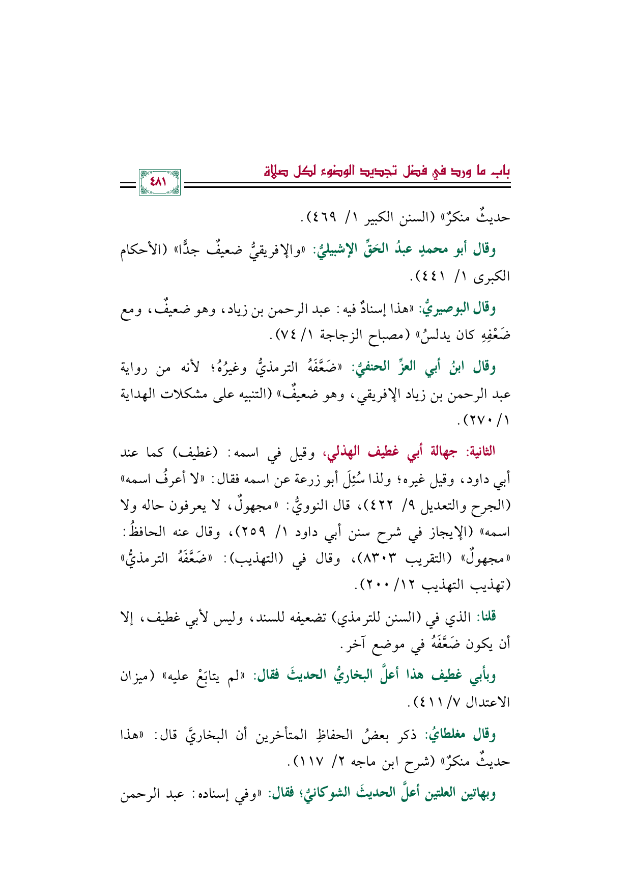 الثانية: جهالة أبي غطيف الهذلي، وقيل في اسمه: (غطيف) كما عند أبي داود، وقيل غيره؛ ولذا سُئِلَ أبو زرعة عن اسمه فقال: "لا أعرفُ اسمه" (الجرح والتعديل ٩/ ٤٢٢)، قال النوويُّ: "مجهولٌ، لا يعرفون حاله ولا اسمه" (الإيجاز في شرح سنن أبي داود ١/ ٢٥٩)، وقال عنه الحافظُ: "مجهولٌ" (التقريب ٨٣٠٣)، وقال في (التهذيب): "ضَعَّفَهُ الترمذيُّ" (تهذيب التهذيب ١٢/ ٢٠٠).