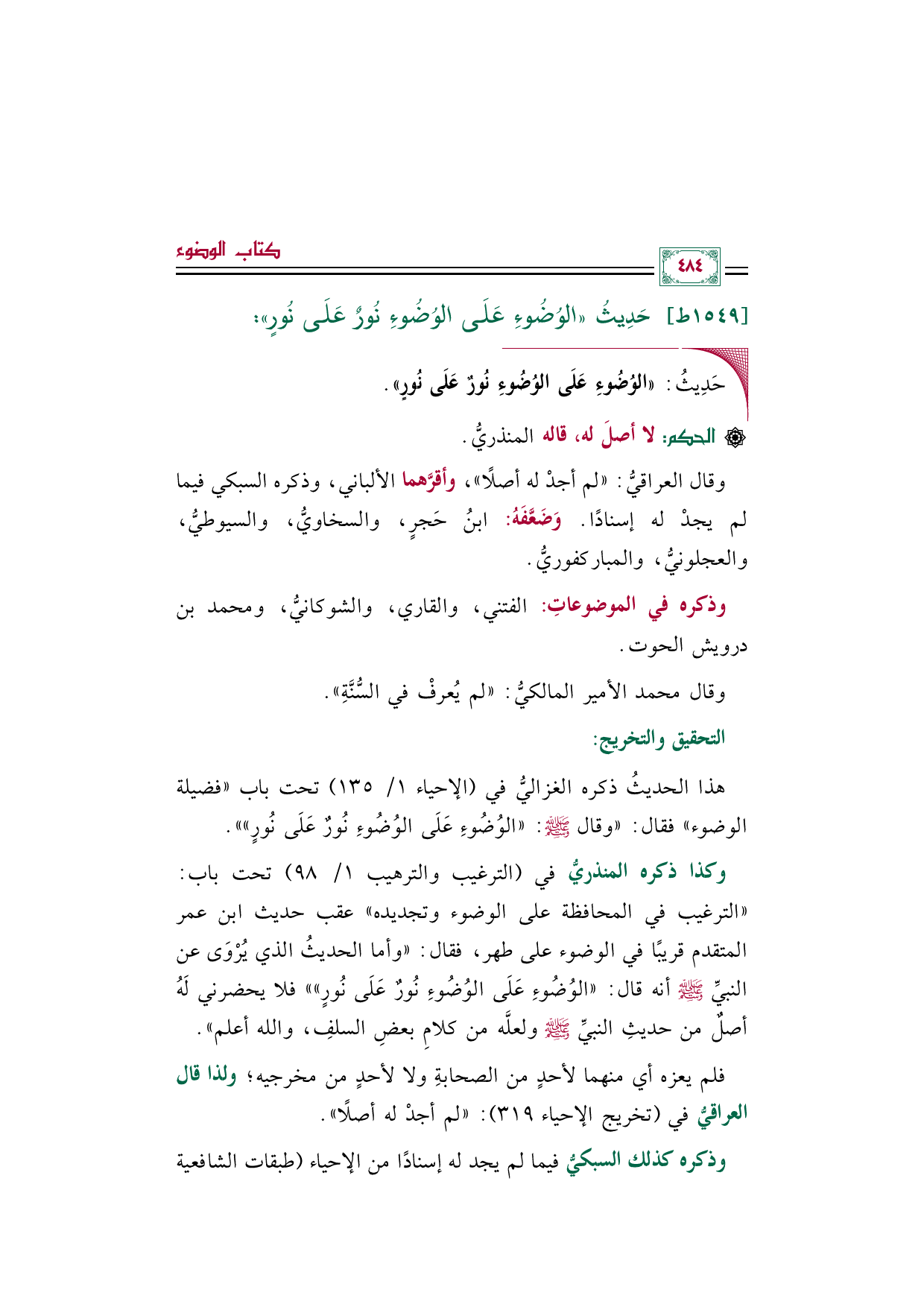 وكذا ذكره المنذريُّ في (الترغيب والترهيب ١/ ٩٨) تحت باب: " الترغيب في المحافظة على الوضوء وتجديده" عقب حديث ابن عمر المتقدم قريبًا في الوضوء على طهر، فقال: "وأما الحديثُ الذي يُرْوَى عن النبيِّ صلى الله عليه وسلم أنه قال: «الوُضُوءِ عَلَى الوُضُوءِ نُورٌ عَلَى نُورٍ» " فلا يحضرني لَهُ أصلٌ من حديثِ النبيِّ صلى الله عليه وسلم ولعلَّه من كلامِ بعضِ السلفِ، والله أعلم".