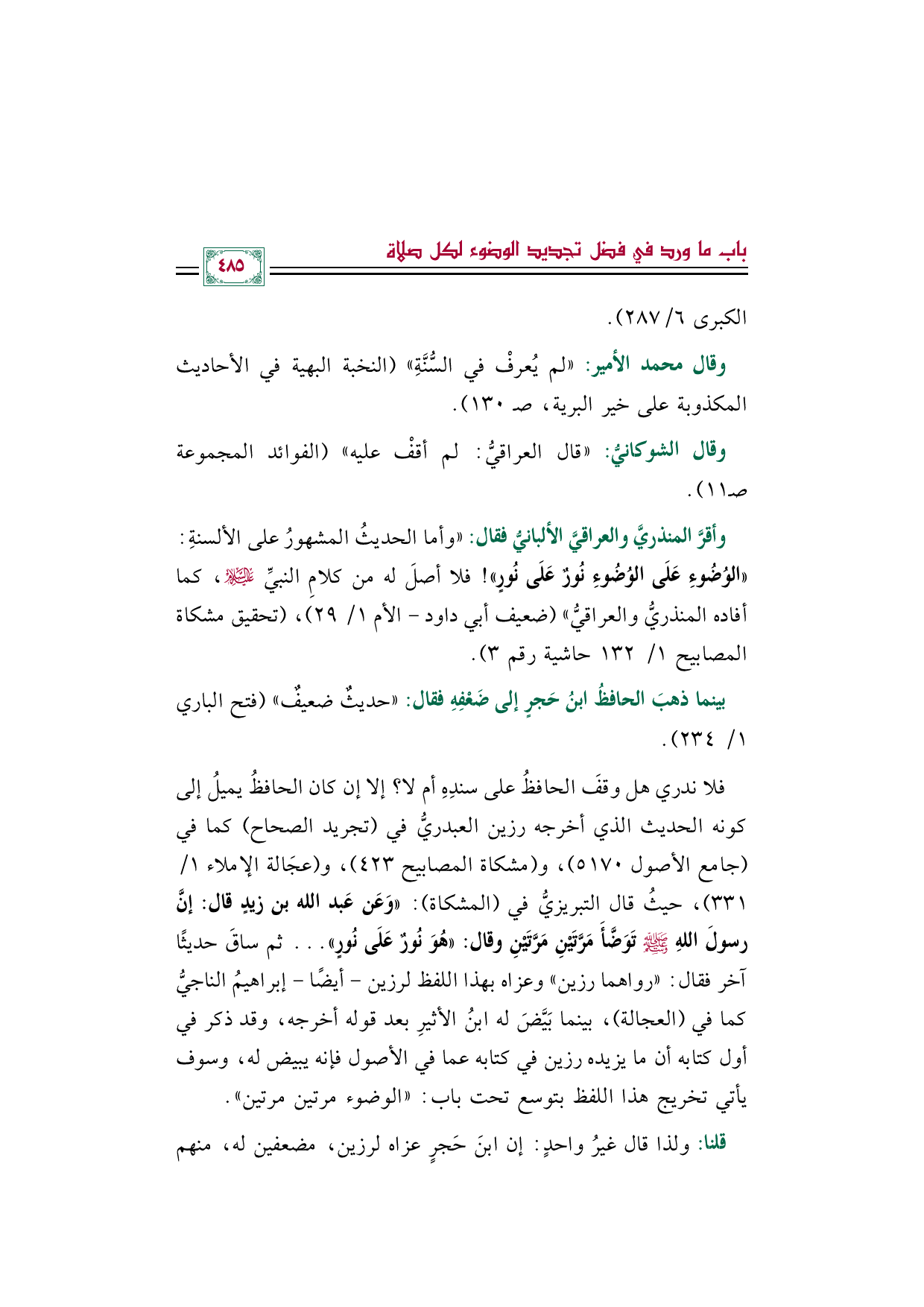وأقرَّ المنذريَّ والعراقيَّ الألبانيُّ فقال: "وأما الحديثُ المشهورُ على الألسنةِ: «الوُضُوءِ عَلَى الوُضُوءِ نُورٌ عَلَى نُورٍ»! فلا أصلَ له من كلامِ النبيِّ عليه السلام، كما أفاده المنذريُّ والعراقيُّ" (ضعيف أبي داود - الأم ١/ ٢٩)، (تحقيق مشكاة المصابيح ١/ ١٣٢ حاشية رقم ٣).