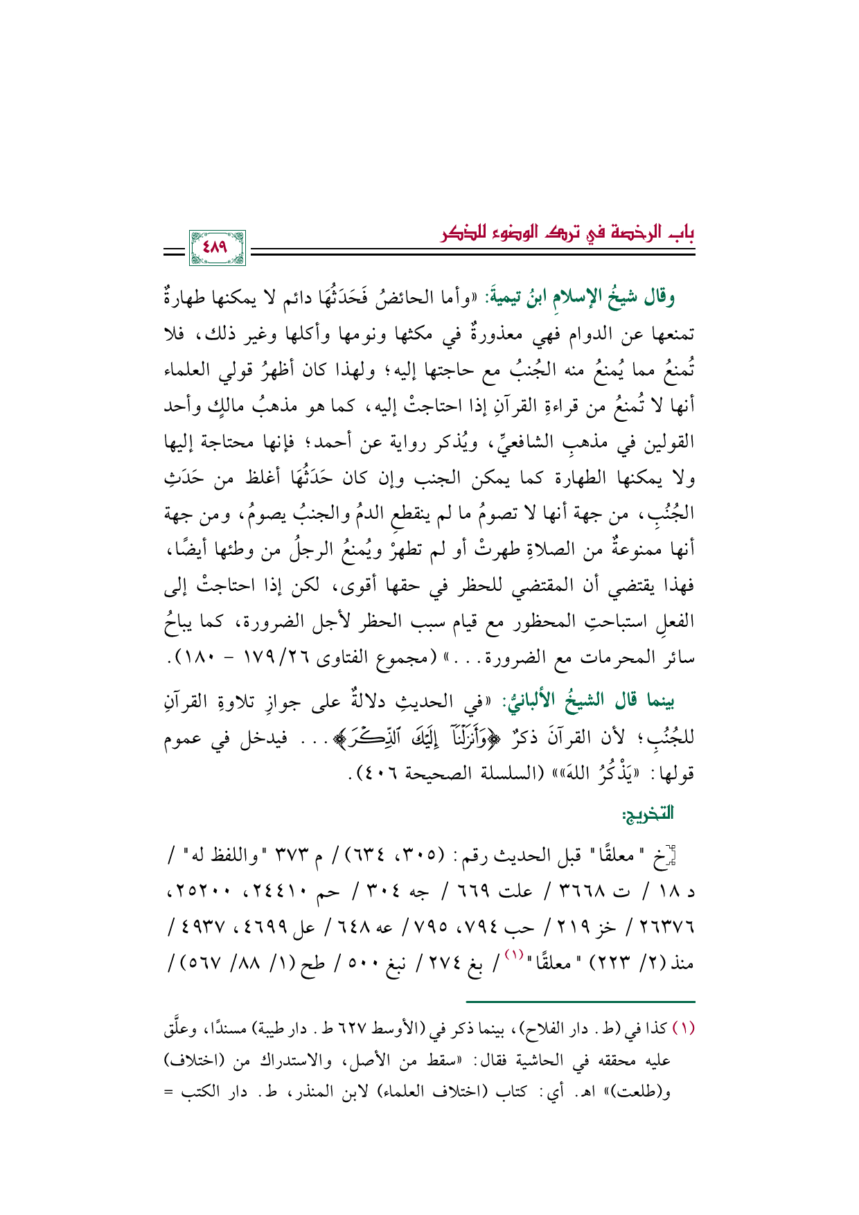 وقال شيخُ الإسلامِ ابنُ تيميةَ: "وأما الحائضُ فَحَدَثُهَا دائم لا يمكنها طهارةٌ تمنعها عن الدوام فهي معذورةٌ في مكثها ونومها وأكلها وغير ذلك، فلا تُمنعُ مما يُمنعُ منه الجُنبُ مع حاجتها إليه؛ ولهذا كان أظهرُ قولي العلماء أنها لا تُمنعُ من قراءةِ القرآنِ إذا احتاجتْ إليه، كما هو مذهبُ مالكٍ وأحد القولين في مذهبِ الشافعيِّ، ويُذكر رواية عن أحمد؛ فإنها محتاجة إليها ولا يمكنها الطهارة كما يمكن الجنب وإن كان حَدَثُهَا أغلظ من حَدَثِ الجُنُبِ، من جهة أنها لا تصومُ ما لم ينقطعِ الدمُ والجنبُ يصومُ، ومن جهة أنها ممنوعةٌ من الصلاةِ طهرتْ أو لم تطهرْ ويُمنعُ الرجلُ من وطئها أيضًا، فهذا يقتضي أن المقتضي للحظر في حقها أقوى، لكن إذا احتاجتْ إلى الفعلِ استباحتِ المحظور مع قيام سبب الحظر لأجل الضرورة، كما يباحُ سائر المحرمات مع الضرورة ... " (مجموع الفتاوى ٢٦/ ١٧٩ - ١٨٠).