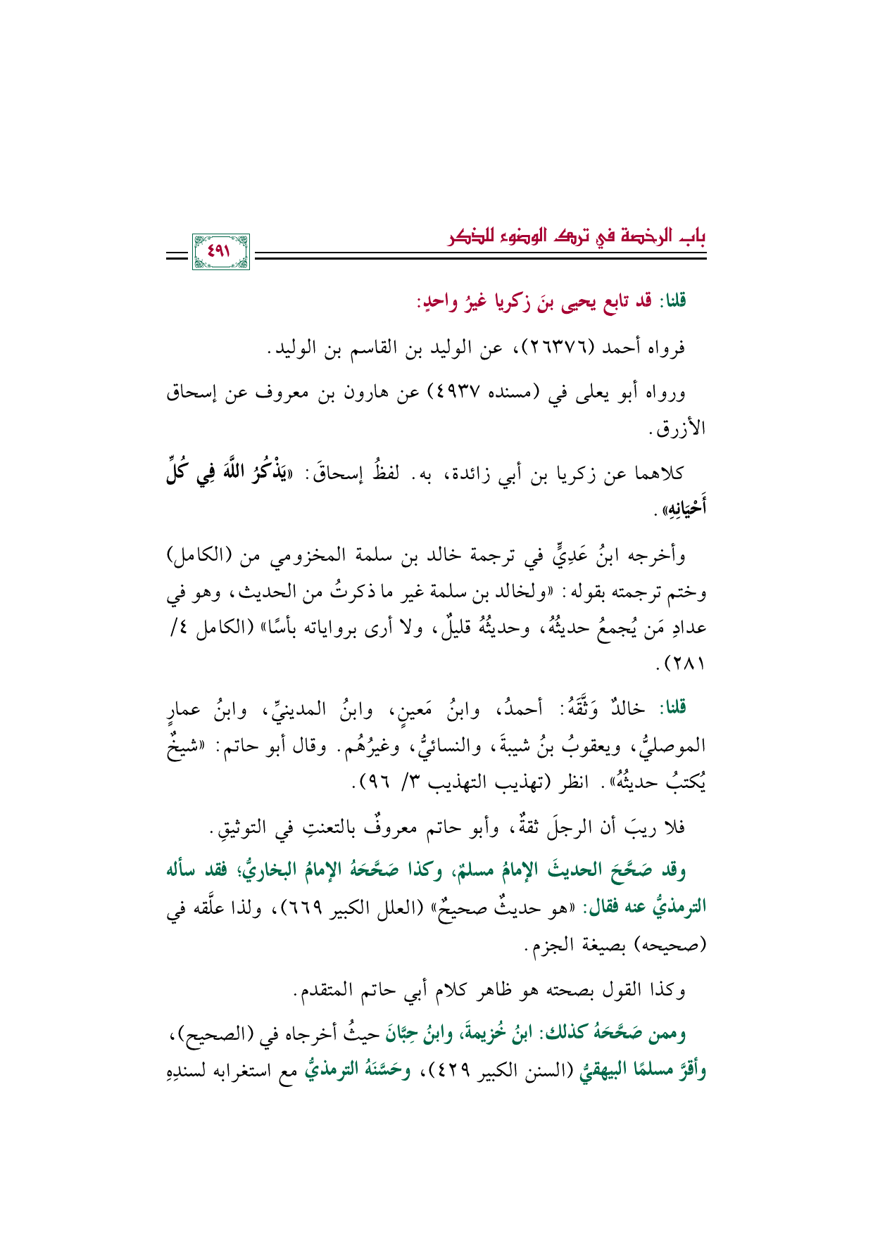 كلاهما عن زكريا بن أبي زائدة، به. لفظُ إسحاقَ: «يَذْكُرُ اللَّهَ فِي كُلِّ أَحْيَانِهِ».