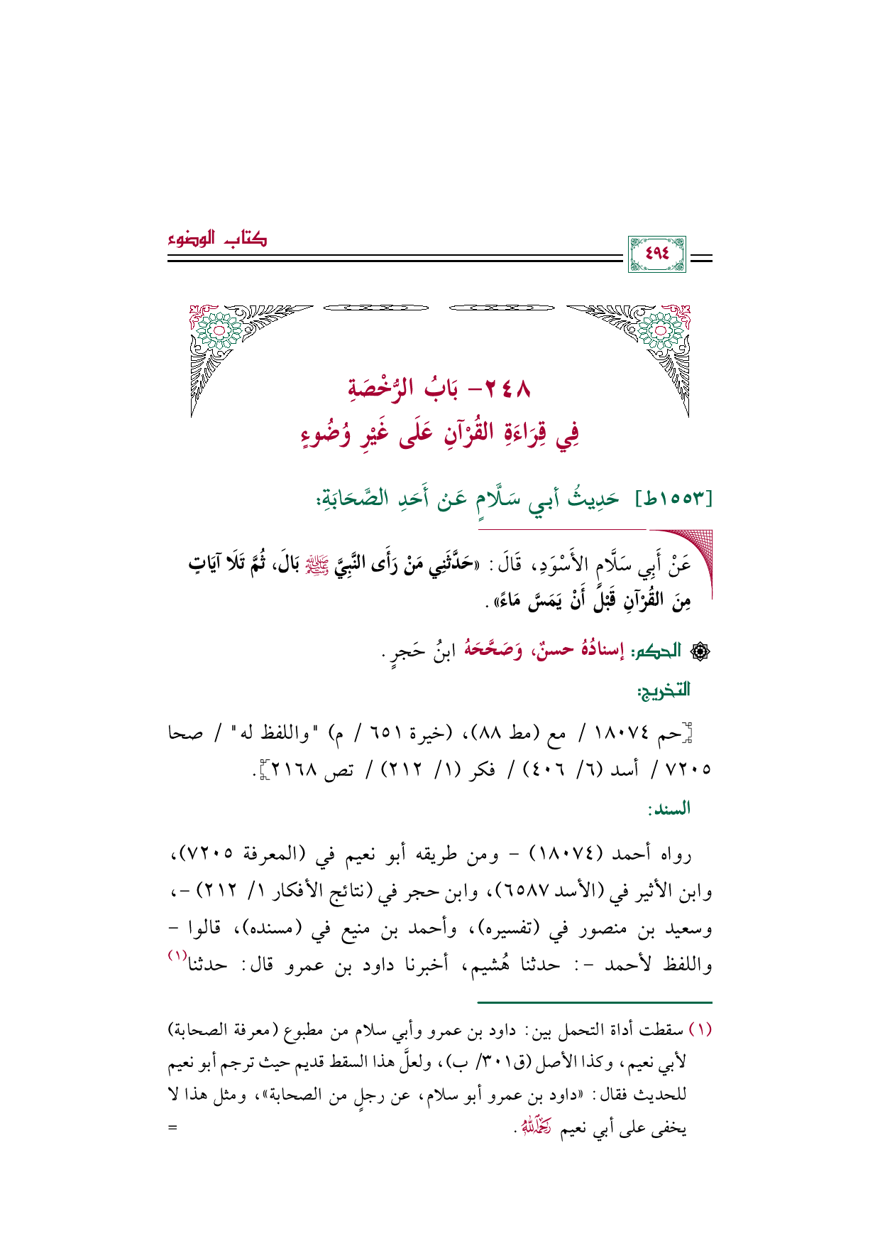 (¬١) سقطت أداة التحمل بين: داود بن عمرو وأبي سلام من مطبوع (معرفة الصحابة) لأبي نعيم، وكذا الأصل (ق ٣٠١/ ب)، ولعلَّ هذا السقط قديم حيث ترجم أبو نعيم للحديث فقال: "داود بن عمرو أبو سلام، عن رجلٍ من الصحابة"، ومثل هذا لا يخفى على أبي نعيم رحمه الله.