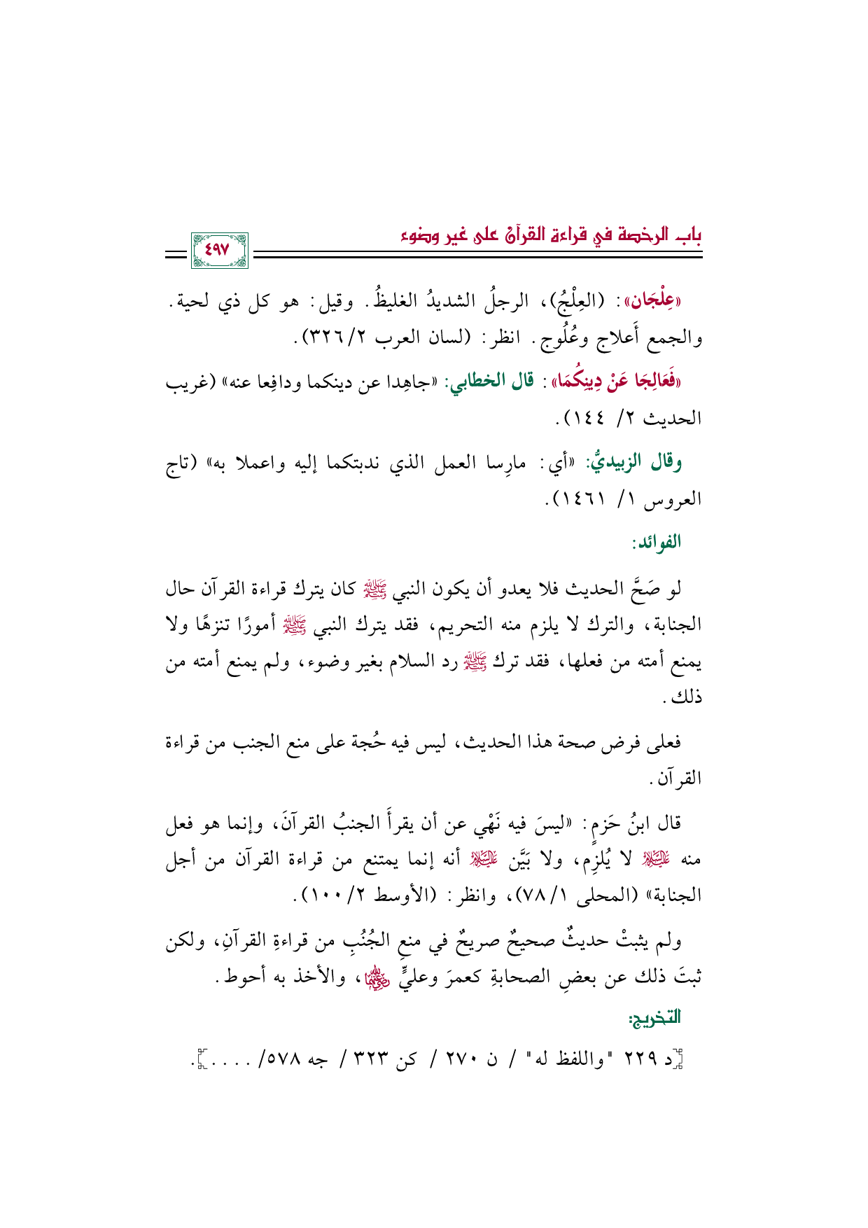 قال ابنُ حَزمٍ: "ليسَ فيه نَهْي عن أن يقرأَ الجنبُ القرآنَ، وإنما هو فعل منه عليه السلام لا يُلزِم، ولا بَيَّن عليه السلام أنه إنما يمتنع من قراءة القرآن من أجل الجنابة" (المحلى ١/ ٧٨)، وانظر: (الأوسط ٢/ ١٠٠).