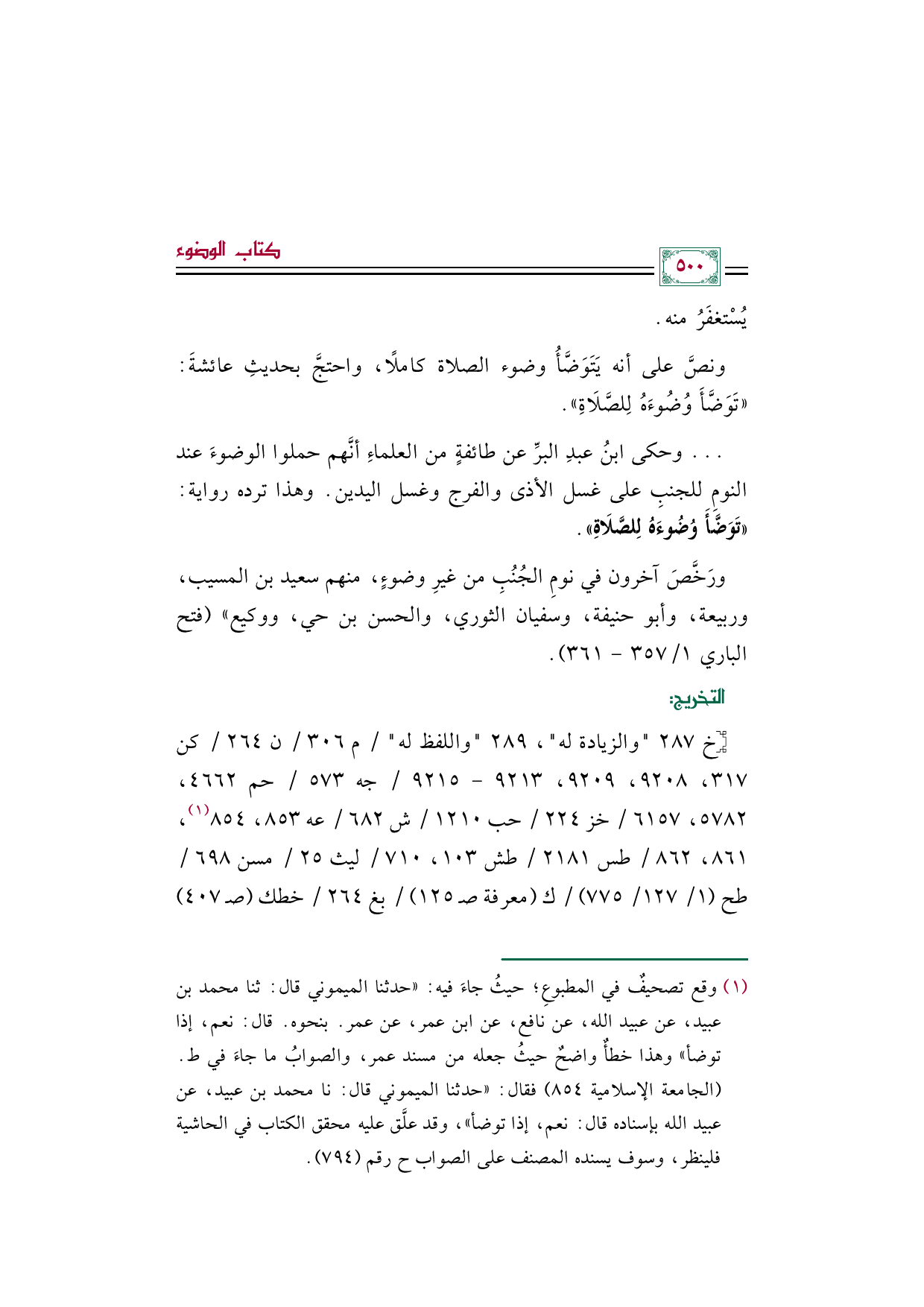 (¬١) وقع تصحيفٌ في المطبوعِ؛ حيثُ جاءَ فيه: "حدثنا الميموني قال: ثنا محمد بن عبيد، عن عبيد الله، عن نافع، عن ابن عمر، عن عمر. بنحوه. قال: نعم، إذا توضأ" وهذا خطأٌ واضحٌ حيثُ جعله من مسند عمر، والصوابُ ما جاءَ في ط. (الجامعة الإسلامية ٨٥٤) فقال: "حدثنا الميموني قال: نا محمد بن عبيد، عن عبيد الله بإسناده قال: نعم، إذا توضأ"، وقد علَّق عليه محقق الكتاب في الحاشية فلينظر، وسوف يسنده المصنف على الصواب ح رقم (٧٩٤).