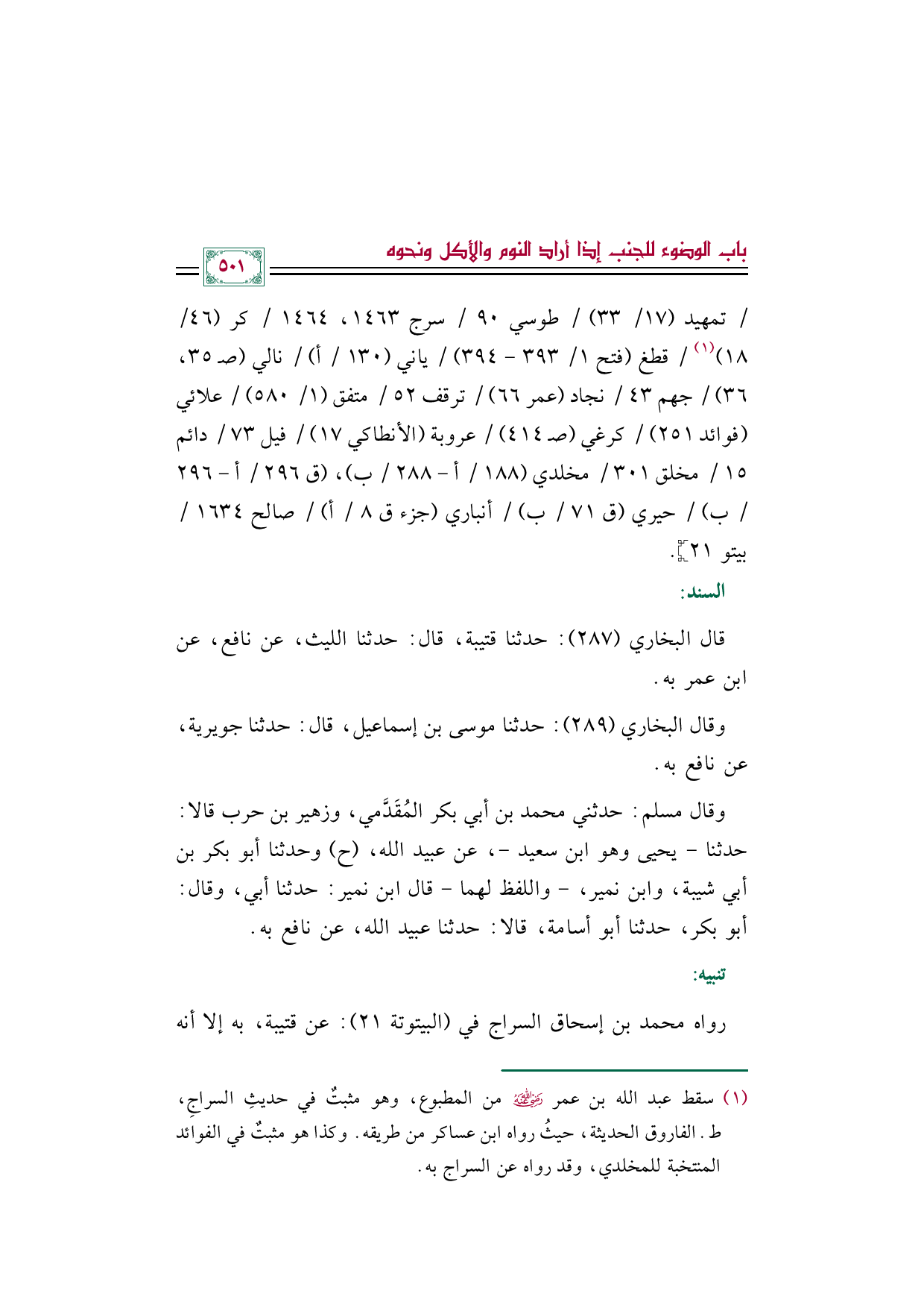 (¬١) سقط عبد الله بن عمر رضي الله عنه من المطبوع، وهو مثبتٌ في حديثِ السراجِ، ط. الفاروق الحديثة، حيثُ رواه ابن عساكر من طريقه. وكذا هو مثبتٌ في الفوائد المنتخبة للمخلدي، وقد رواه عن السراج به.
