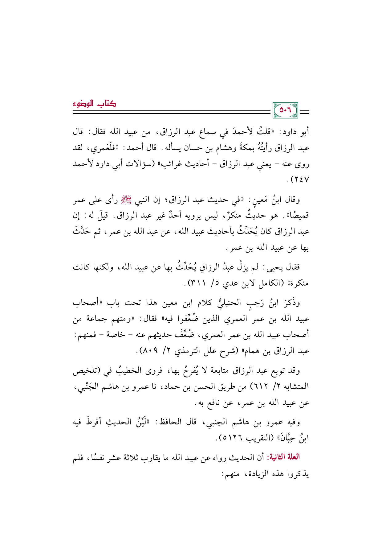 وذَكرَ ابنُ رَجبٍ الحنبليُّ كلام ابن معين هذا تحت باب "أصحاب عبيد الله بن عمر العمري الذين ضُعِّفوا فيه" فقال: "ومنهم جماعة من أصحاب عبيد الله بن عمر العمري، ضُعِّفَ حديثهم عنه -خاصة- فمنهم: عبد الرزاق بن همام" (شرح علل الترمذي ٢/ ٨٠٩).