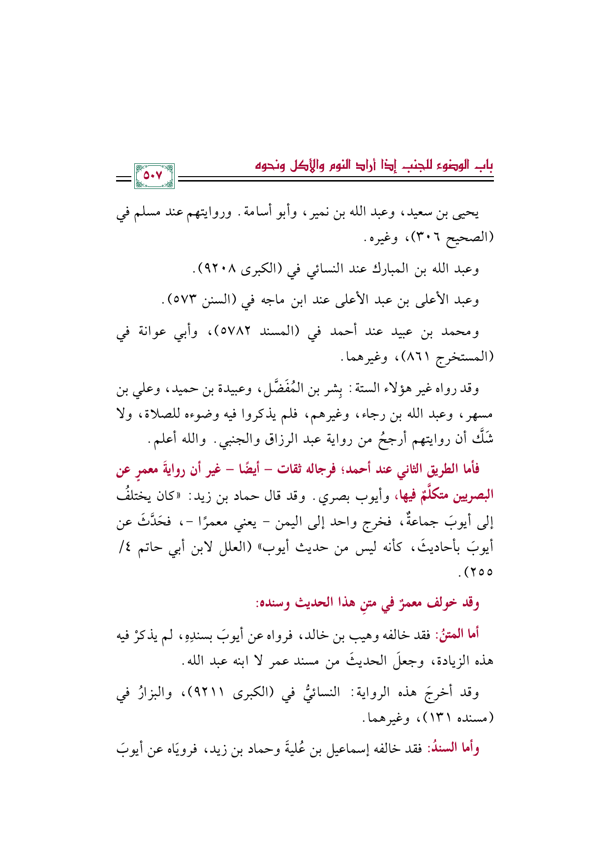 فأما الطريق الثاني عند أحمد؛ فرجاله ثقات -أيضًا- غير أن روايةَ معمرٍ عن البصريين متكلَّمٌ فيها، وأيوب بصري. وقد قال حماد بن زيد: "كان يختلفُ إلى أيوبَ جماعةٌ، فخرج واحد إلى اليمن -يعني معمرًا-، فحَدَّثَ عن أيوبَ بأحاديثَ، كأنه ليس من حديث أيوب" (العلل لابن أبي حاتم ٤/ ٢٥٥).