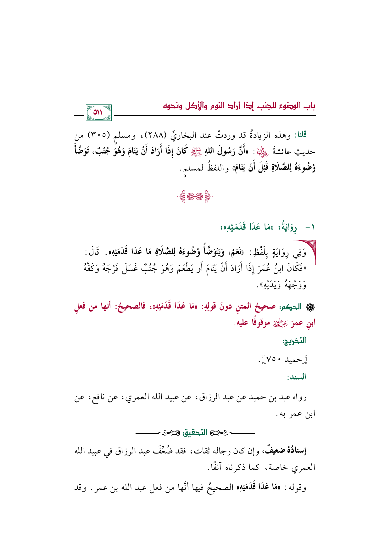 • وَفِي رِوَايَةٍ بِلَفْظِ: «نَعَمْ، وَيَتَوَضَّأُ وُضُوءَهُ لِلصَّلَاةِ مَا عَدَا قَدَمَيْهِ». قَالَ: "فَكَانَ ابنُ عُمَرَ إِذَا أَرَادَ أَنْ يَنَامَ أَو يَطْعَمَ وَهُوَ جُنُبٌ غَسَلَ فَرْجَهُ وَكَفَّهُ وَوَجْهَهُ وَيَدَيْهِ".