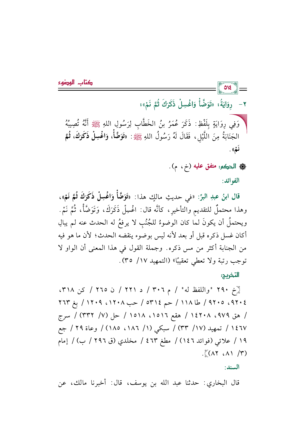 • وَفِي رِوَايَةٍ بِلَفْظِ: ذَكَرَ عُمَرُ بنُ الخَطَّابِ لِرَسُولِ اللهِ صلى الله عليه وسلم أَنَّهُ تُصِيبُهُ الجَنَابَةُ مِنَ اللَّيْلِ، فَقَالَ لَهُ رَسُولُ اللهِ صلى الله عليه وسلم: «تَوَضَّأْ، وَاغْسِلْ ذَكَرَكَ، ثُمَّ نَمْ».