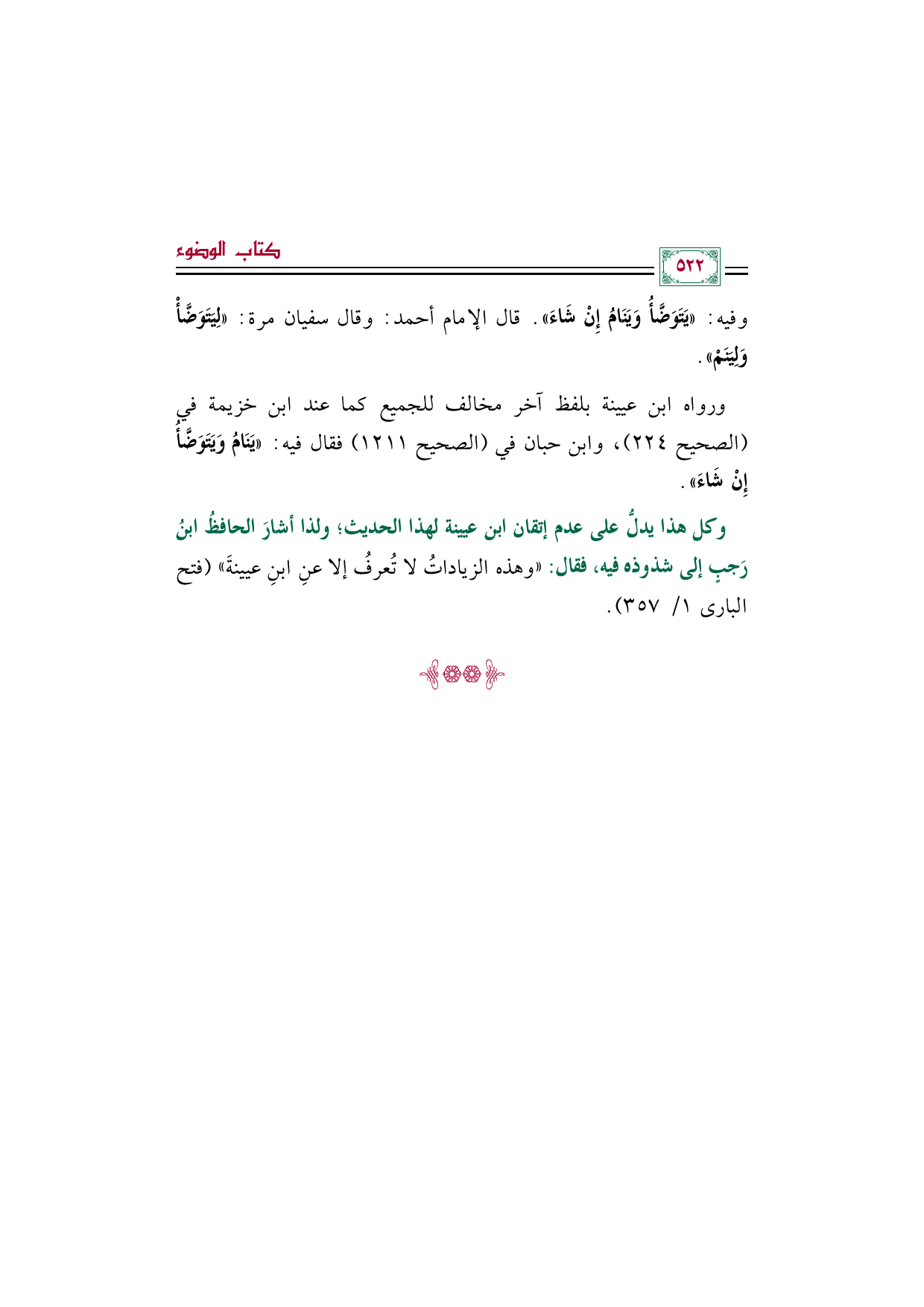 ورواه ابن عيينة بلفظ آخر مخالف للجميع كما عند ابن خزيمة في (الصحيح ٢٢٤)، وابن حبان في (الصحيح ١٢١١) فقال فيه: «يَنَامُ وَيَتَوَضَّأُ إِنْ شَاءَ».