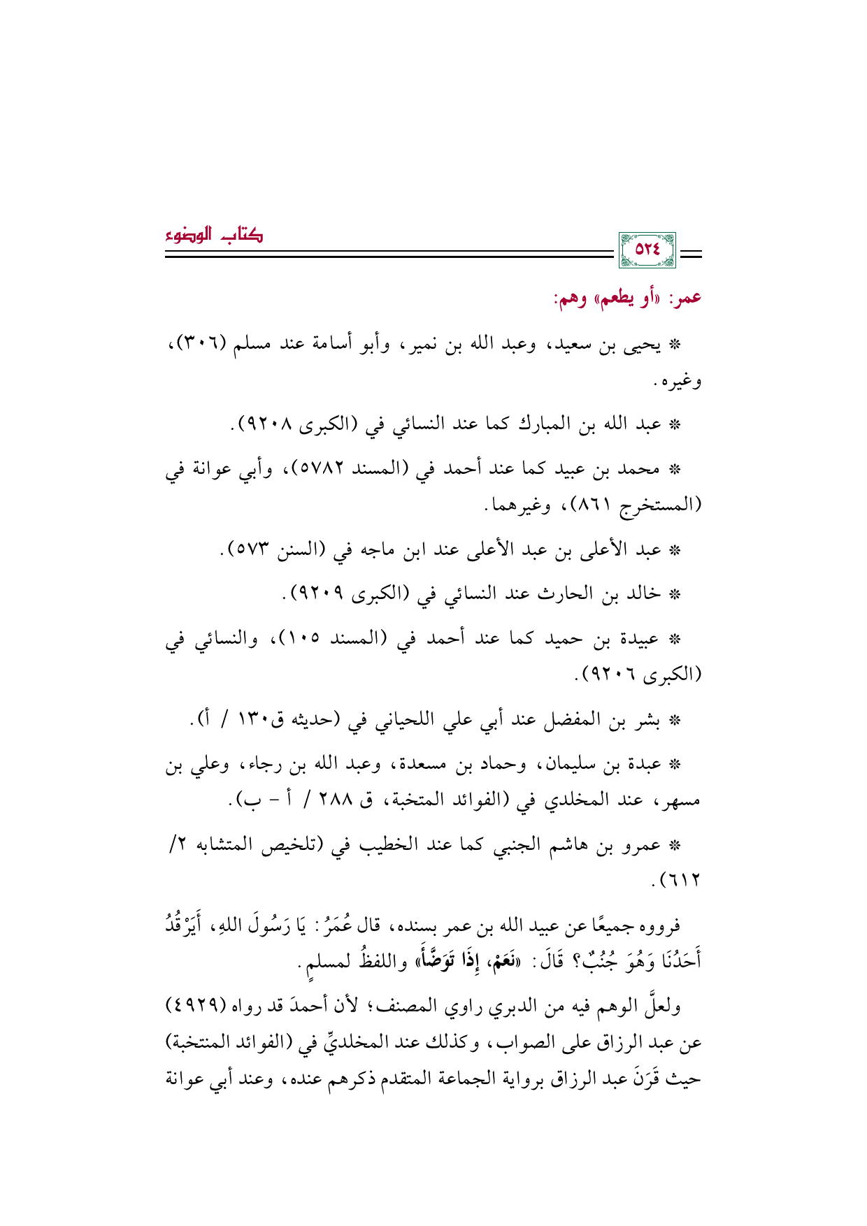 فرووه جميعًا عن عبيد الله بن عمر بسنده، قال عُمَرُ: يَا رَسُولَ اللهِ، أَيَرْقُدُ أَحَدُنَا وَهُوَ جُنُبٌ؟ قَالَ: «نَعَمْ، إِذَا تَوَضَّأَ» واللفظُ لمسلمٍ.