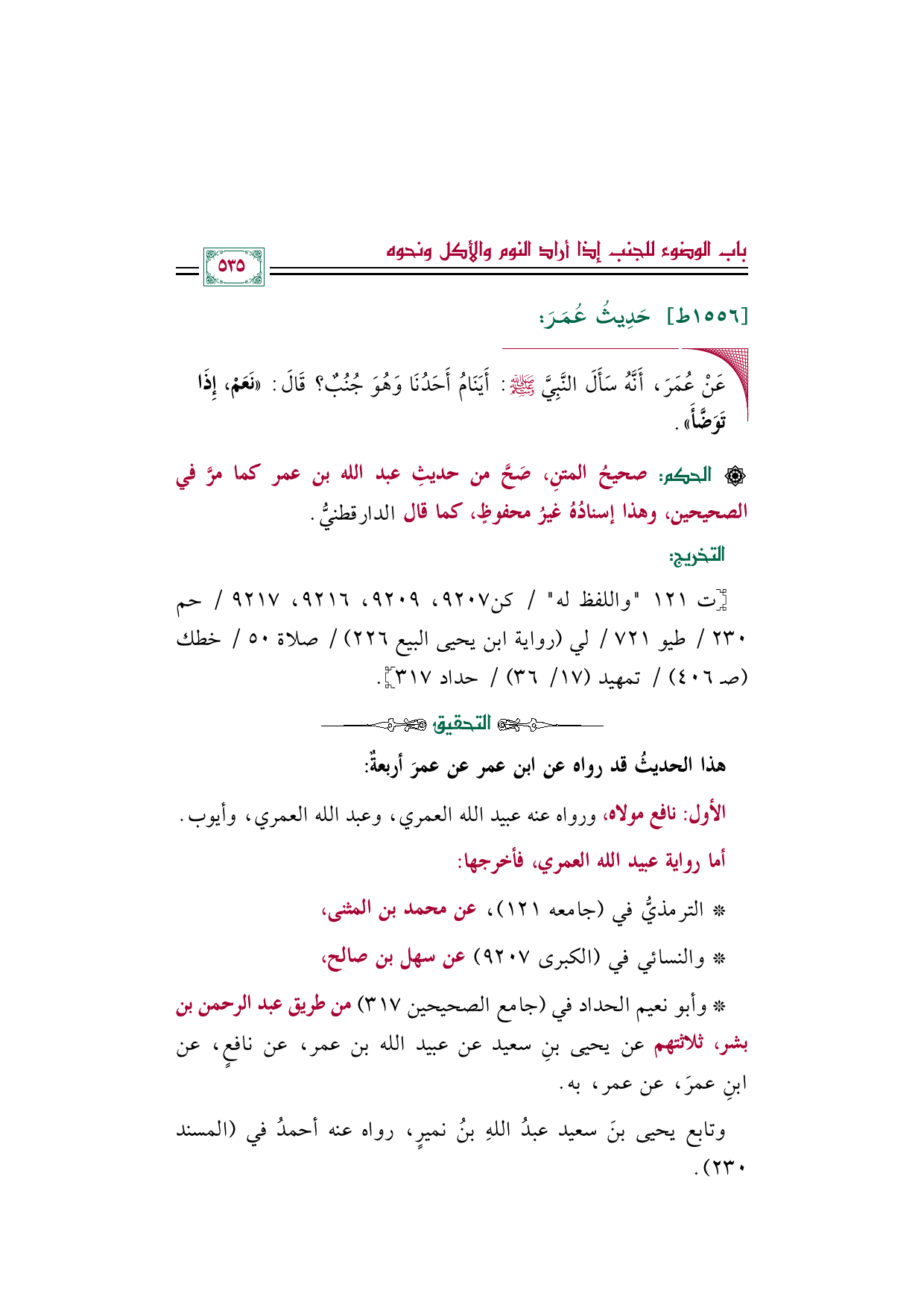 - وأبو نعيم الحداد في (جامع الصحيحين ٣١٧) من طريق عبد الرحمن بن بشر، ثلاثتهم عن يحيى بنِ سعيد عن عبيد الله بن عمر، عن نافعٍ، عن ابنِ عمرَ، عن عمر، به.