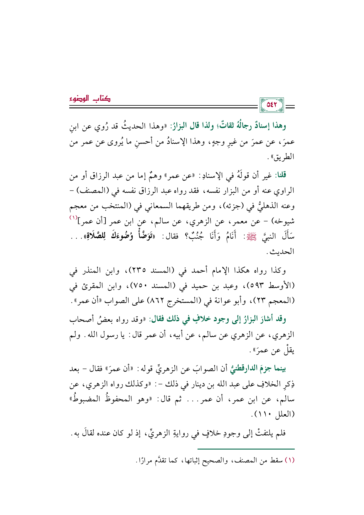 قلنا: غير أن قولَهُ في الإسنادِ: "عن عمر" وهمٌ إما من عبد الرزاق أو من الراوي عنه أو من البزار نفسه، فقد رواه عبد الرزاق نفسه في (المصنف) -وعنه الذهليُّ في (جزئه)، ومن طريقهما السمعاني في (المنتخب من معجم شيوخه) - عن معمر، عن الزهري، عن سالم، عن ابن عمر [أن عمر] (¬١) سَأَلَ النبيَّ صلى الله عليه وسلم: أَنَامُ وَأَنَا جُنُبٌ؟ فقال: «تَوَضَّأْ وُضُوءَكَ لِلصَّلَاةِ» ... الحديث.