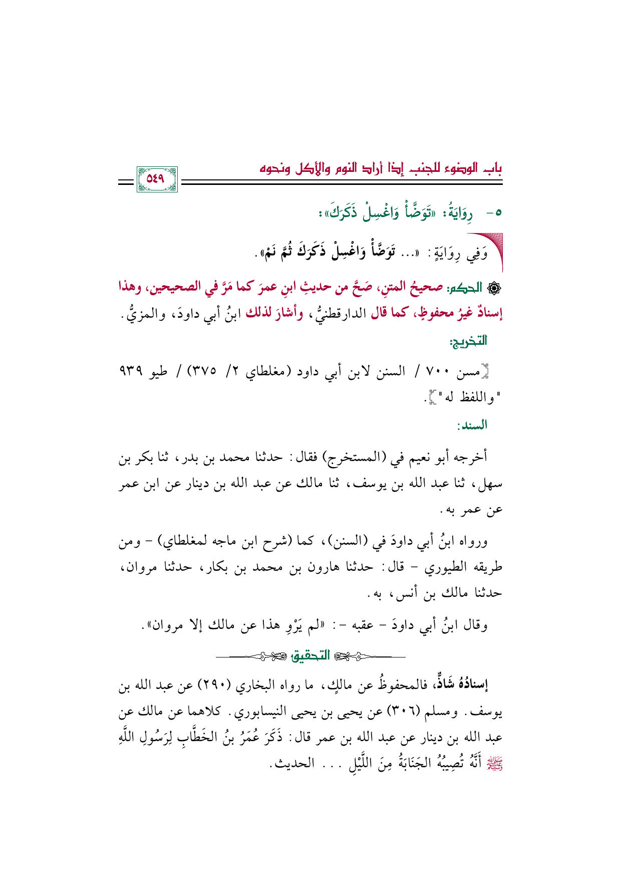 إسنادُهُ شَاذٌّ، فالمحفوظُ عن مالكٍ، ما رواه البخاري (٢٩٠) عن عبد الله بن يوسف. ومسلم (٣٠٦) عن يحيى بن يحيى النيسابوري. كلاهما عن مالك عن عبد الله بن دينار عن عبد الله بن عمر قال: ذَكَرَ عُمَرُ بنُ الخَطَّابِ لِرَسُولِ اللَّهِ صلى الله عليه وسلم أَنَّهُ تُصِيبُهُ الجَنَابَةُ مِنَ اللَّيْلِ ... الحديث.