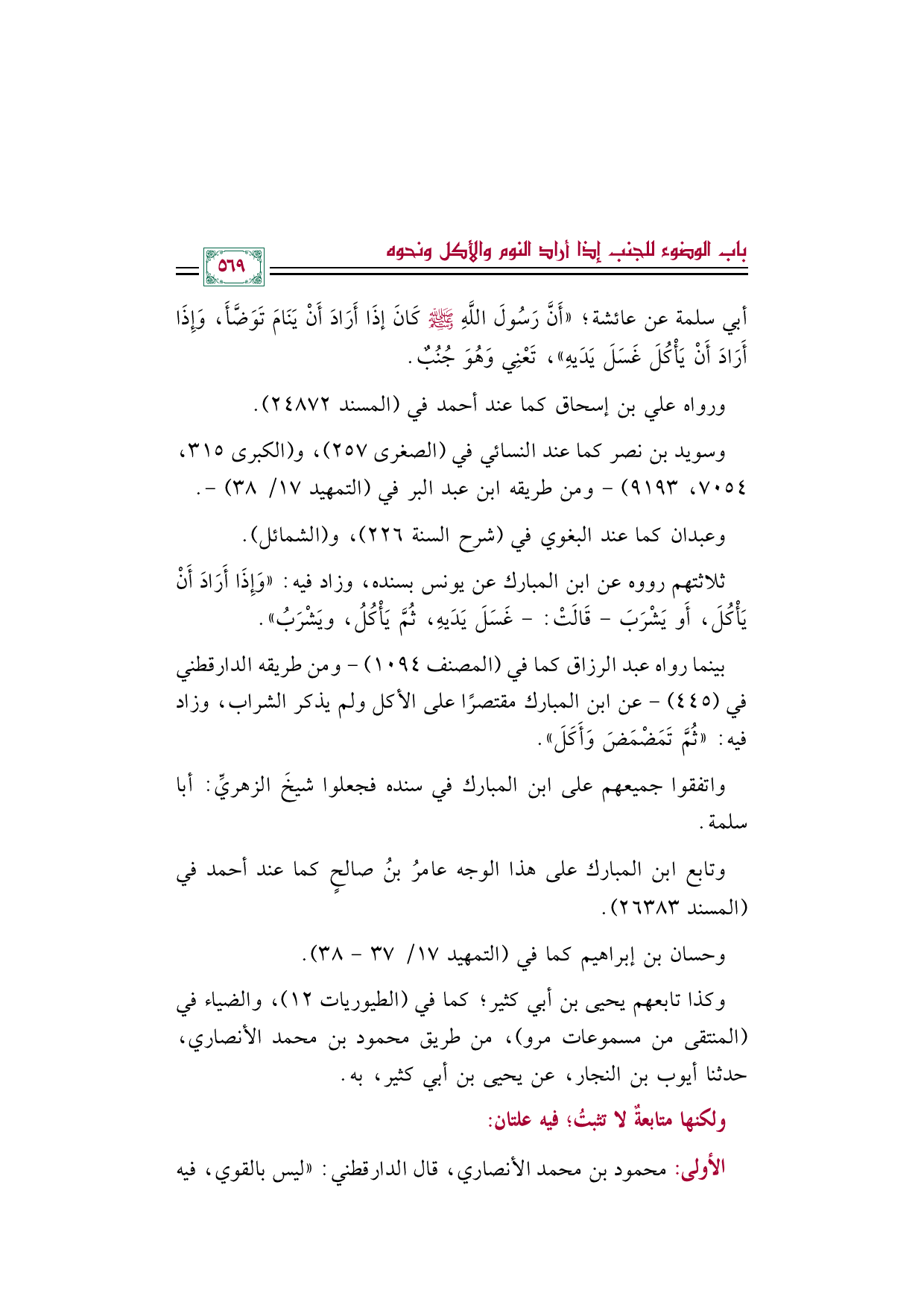 أبي سلمة عن عائشة؛ «أَنَّ رَسُولَ اللَّهِ صلى الله عليه وسلم كَانَ إذَا أَرَادَ أَنْ يَنَامَ تَوَضَّأَ، وَإِذَا أَرَادَ أَنْ يَأْكُلَ غَسَلَ يَدَيهِ»، تَعْنِي وَهُوَ جُنُبٌ.