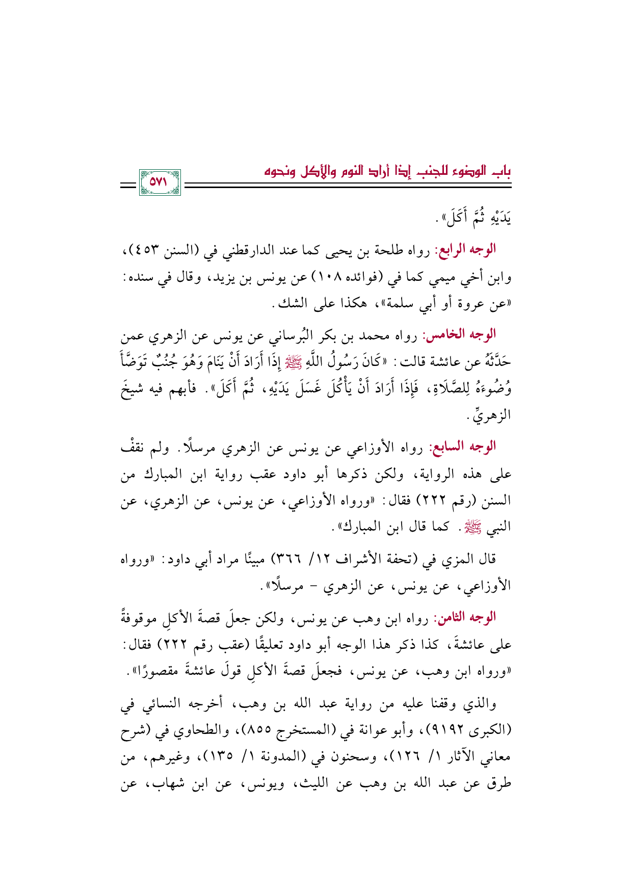 الوجه الخامس: رواه محمد بن بكر البُرساني عن يونس عن الزهري عمن حَدَّثَهُ عن عائشة قالت: ((كَانَ رَسُولُ اللَّهِ صلى الله عليه وسلم إِذَا أَرَادَ أَنْ يَنَامَ وَهُوَ جُنُبٌ تَوَضَّأَ وُضُوءَهُ لِلصَّلَاةِ، فَإِذَا أَرَادَ أَنْ يَأْكُلَ غَسَلَ يَدَيْهِ، ثُمَّ أَكَلَ)). فأبهم فيه شيخَ الزهريِّ.