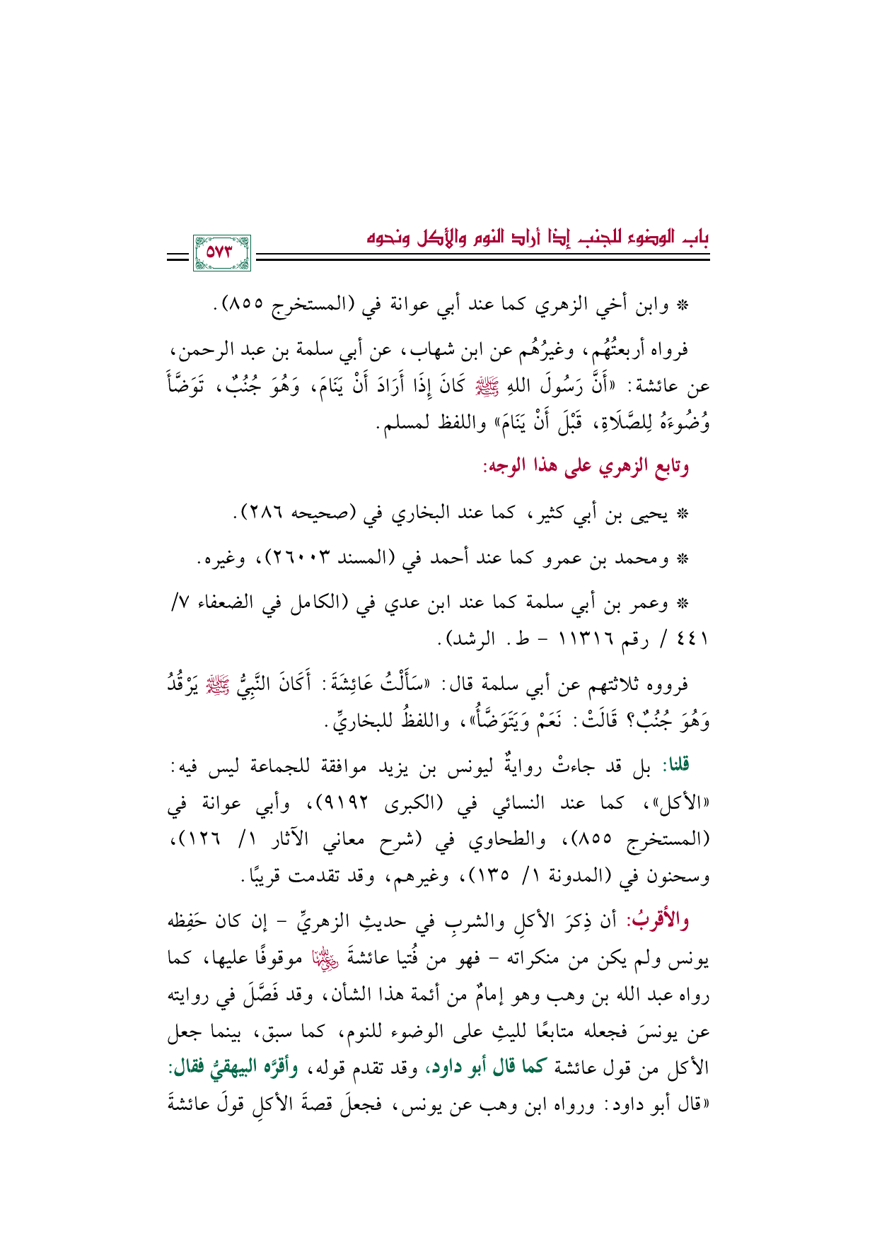 والأقربُ: أن ذِكرَ الأكلِ والشربِ في حديثِ الزهريِّ -إن كان حَفِظه يونس ولم يكن من منكراته- فهو من فُتيا عائشةَ رضي الله عنها موقوفًا عليها، كما رواه عبد الله بن وهب وهو إمامٌ من أئمة هذا الشأن، وقد فَصَّلَ في روايته عن يونسَ فجعله متابعًا لليثِ على الوضوء للنوم، كما سبق، بينما جعل الأكل من قول عائشة كما قال أبو داود، وقد تقدم قوله، وأقرَّه البيهقيُّ فقال: "قال أبو داود: ورواه ابن وهب عن يونس، فجعلَ قصةَ الأكلِ قولَ عائشةَ
