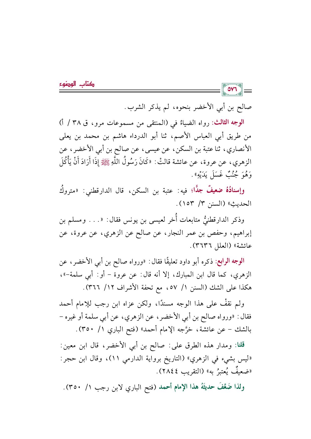 الوجه الثالث: رواه الضياءُ في (المنتقى من مسموعات مرو، ق ٣٨/ أ) من طريق أبي العباس الأصم، ثنا أبو الدرداء هاشم بن محمد بن يعلى الأنصاري، ثنا عتبة بن السكن، عن عيسى، عن صالح بن أبي الأخضر، عن الزهري، عن عروة، عن عائشة قالتْ: «كَانَ رَسُولُ اللَّهِ صلى الله عليه وسلم إِذَا أَرَادَ أَنْ يَأْكُلَ وَهُوَ جُنُبٌ غَسَلَ يَدَيْهِ».