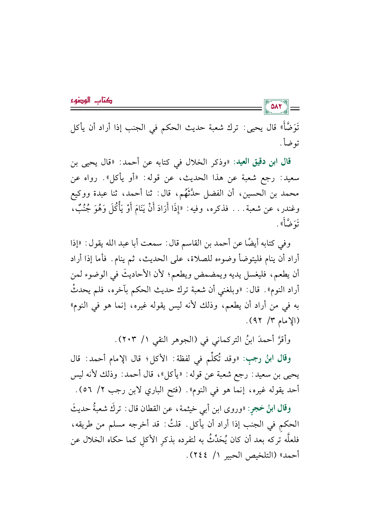 وفي كتابه أيضًا عن أحمد بن القاسم قال: سمعت أبا عبد الله يقول: "إذا أراد أن ينام فليتوضأ وضوءه للصلاة، على الحديث، ثم ينام. فأما إذا أراد أن يطعم، فليغسل يديه ويمضمض ويطعم؛ لأن الأحاديثَ في الوضوء لمن أراد النوم". قال: "وبلغني أن شعبة ترك حديث الحكم بآخره، فلم يحدثْ به في من أراد أن يطعم، وذلك لأنه ليس يقوله غيره، إنما هو في النوم" (الإمام ٣/ ٩٢).