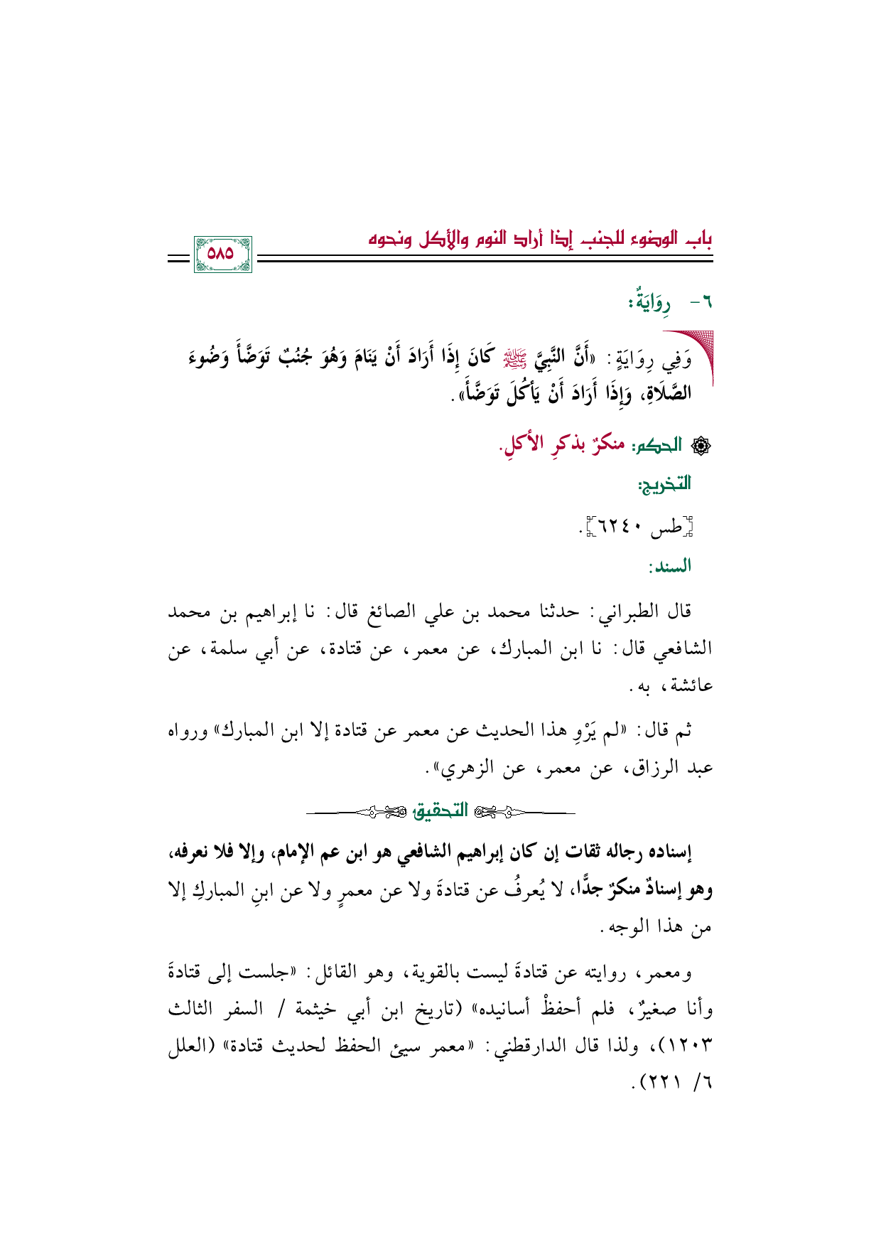 ومعمر، روايته عن قتادةَ ليست بالقوية، وهو القائل: "جلست إلى قتادةَ وأنا صغيرٌ، فلم أحفظْ أسانيده" (تاريخ ابن أبي خيثمة/ السفر الثالث ١٢٠٣)، ولذا قال الدارقطني: "معمر سيئ الحفظ لحديث قتادة" (العلل ٦/ ٢٢١).