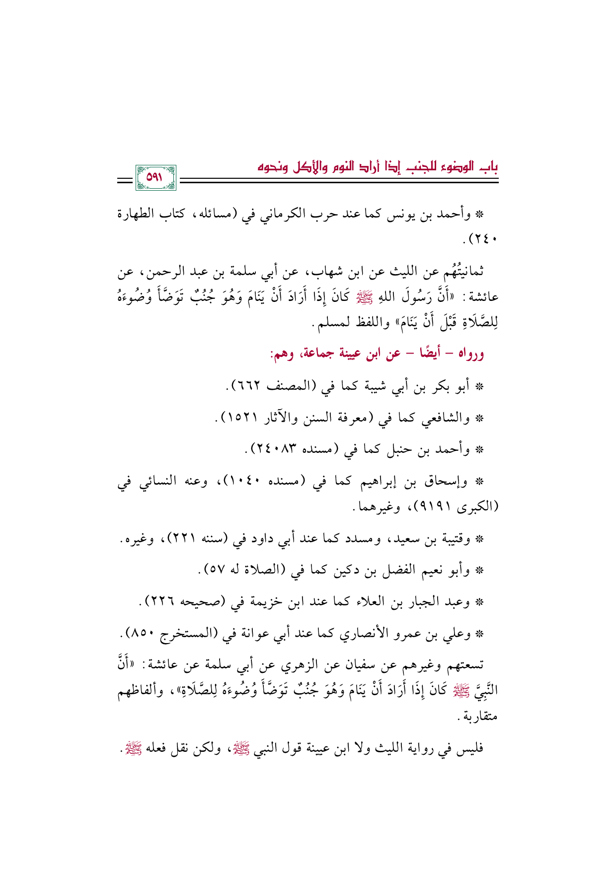 تسعتهم وغيرهم عن سفيان عن الزهري عن أبي سلمة عن عائشة: ((أَنَّ النَّبِيَّ صلى الله عليه وسلم كَانَ إِذَا أَرَادَ أَنْ يَنَامَ وَهُوَ جُنُبٌ تَوَضَّأَ وُضُوءَهُ لِلصَّلَاةِ))، وألفاظهم متقاربة.
