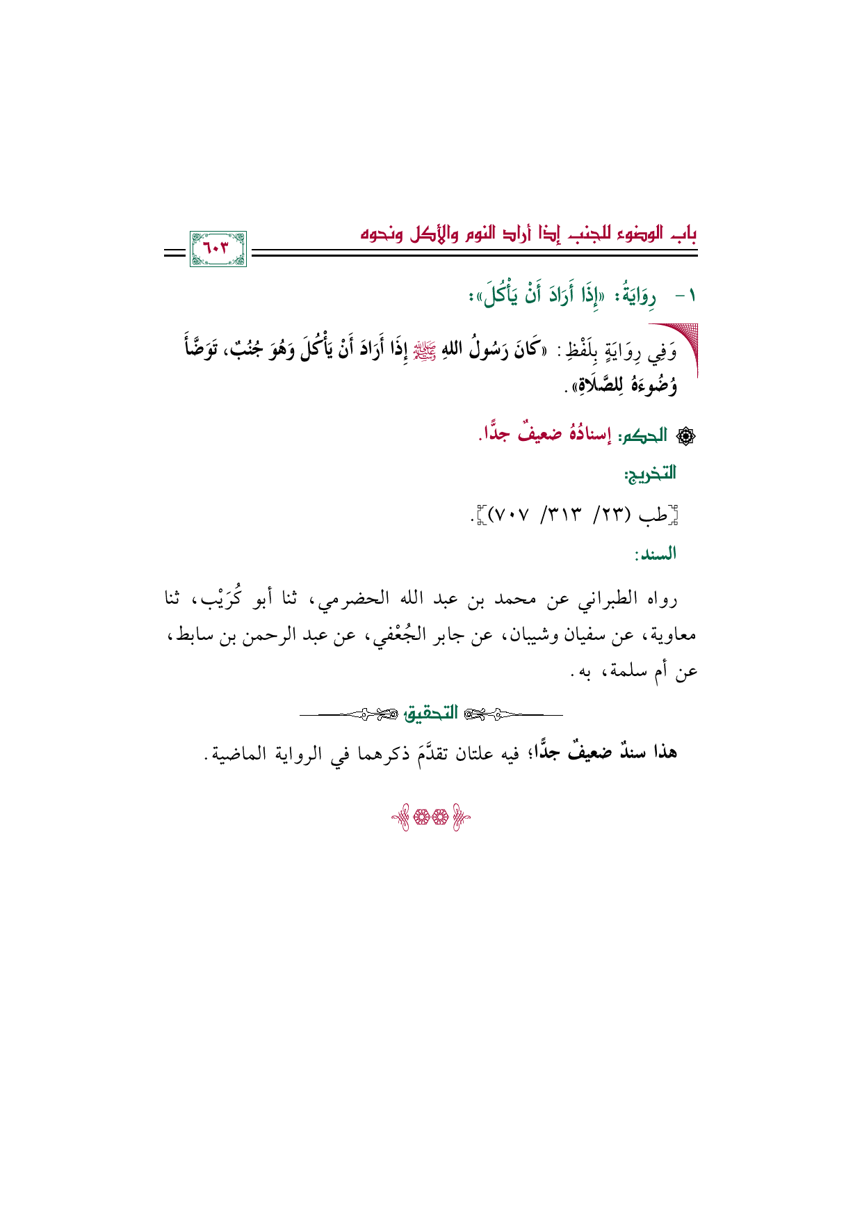 • وَفِي رِوَايَةٍ بِلَفْظِ: «كَانَ رَسُولُ اللهِ صلى الله عليه وسلم إِذَا أَرَادَ أَنْ يَأْكُلَ وَهُوَ جُنُبٌ، تَوَضَّأَ وُضُوءَهُ لِلصَّلَاةِ».