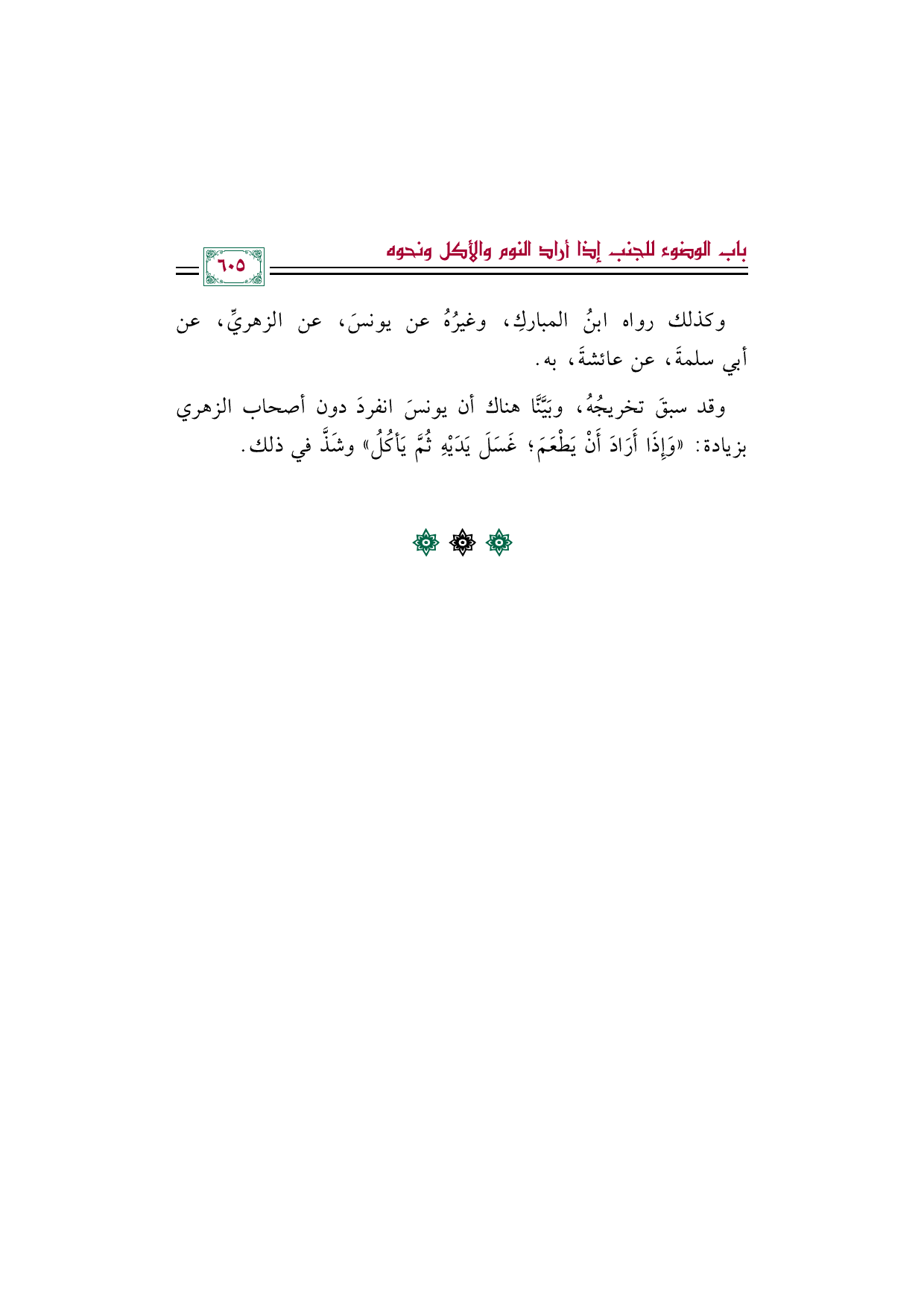 وقد سبقَ تخريجُهُ، وبَيَّنَّا هناك أن يونسَ انفردَ دون أصحاب الزهري بزيادة: «وَإِذَا أَرَادَ أَنْ يَطْعَمَ؛ غَسَلَ يَدَيْهِ ثُمَّ يَأكُلُ» وشَذَّ في ذلك.