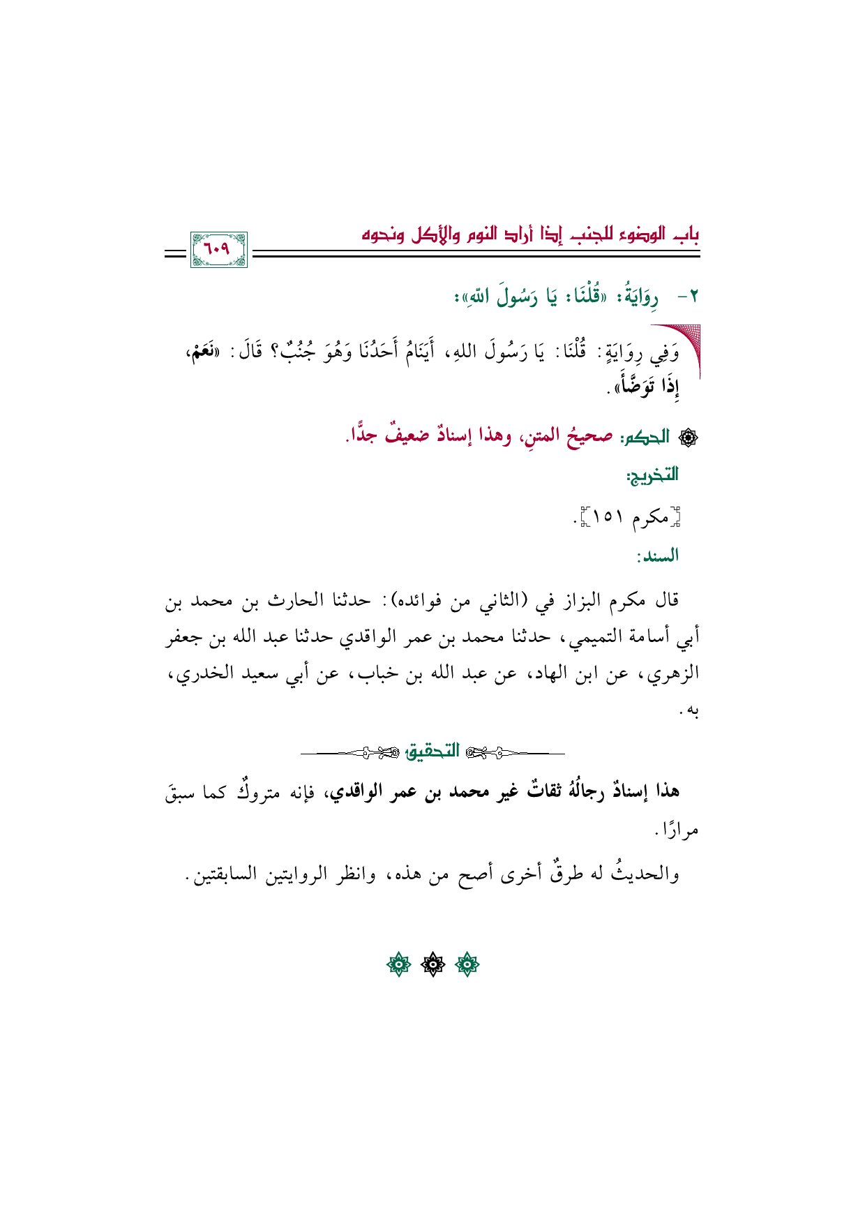 قال مكرم البزاز في (الثاني من فوائده): حدثنا الحارث بن محمد بن أبي أسامة التميمي، حدثنا محمد بن عمر الواقدي حدثنا عبد الله بن جعفر الزهري، عن ابن الهاد، عن عبد الله بن خباب، عن أبي سعيد الخدري، به.